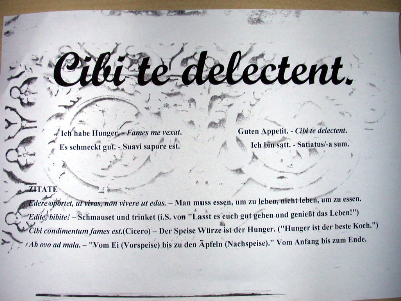 Insgesamt schmeckten uns die Speisen gut trotz zum Teil ungewohnter Geschmackszusammenstellungen. Vor allem die typisch römische Kombination von Süß und Deftig war ungewohnt. Zur Lateinischen Lektüre oder gar zum Rezitieren lateinischer Literatur - wie es bei antiken Gastmählern durchaus üblich war - waren wir dann allerdings nicht mehr fähig: Plenus venter non studet libenter!