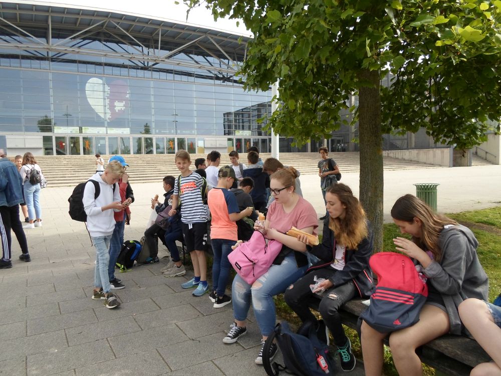 Am Donnerstag den 24.5. um 8 Uhr fuhren wir los. Alle freuten sich schon darauf ihre Austauschpartner/innen wieder zu sehen. Doch erst besuchten wir noch die Stadt Metz. Mit dem Kunstmuseum starteten wir, danach eine Stunde Freizeit in dem riesigen Einkaufszentrum Muse. Mit einer deutschen Stadtführerin erkundeten wir dann noch die Stadt um den Hauptbahnhof und um 14:00 Uhr fuhren wir weiter und kamen dann auch schon um 14:45 Uhr in der Notre Dame Schule in Thionville an. Mit einem Willkommens-snak begrüßten sie uns herzlich. Danach folgten wir den Franzosen, die einen Rundgang durch die Schule mit uns machten. Um 17:00 Uhr wurden wir von unseren Gasteltern abgeholt.