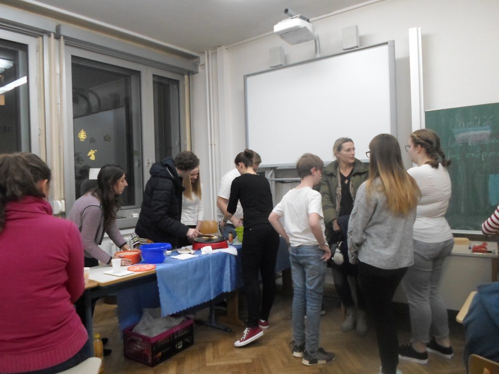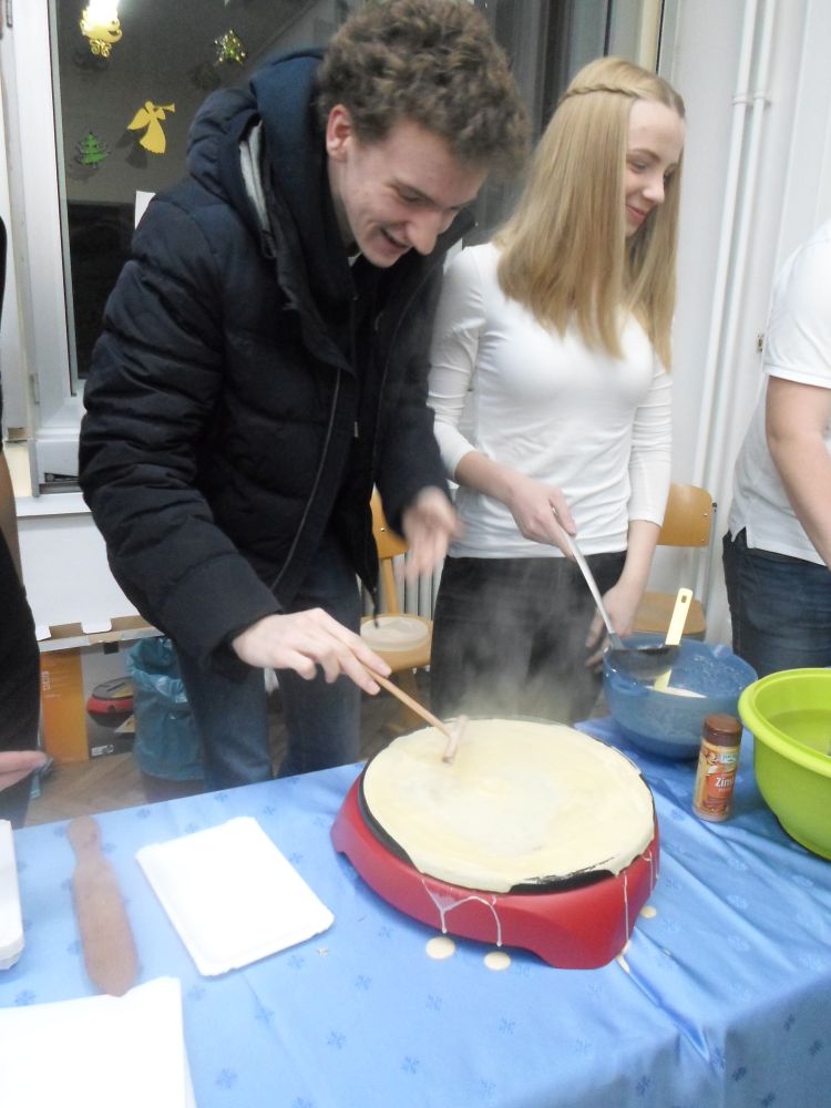 Die Fachschaft Französisch als Veranstalterin dankt den freiwilligen Helfer(inne)n aus der MSS 11 und MSS 13 für ihren tatkräftigen Einsatz mit Teig und Kelle.