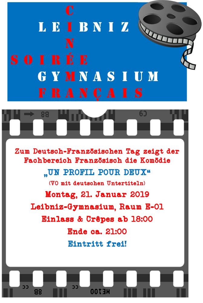 Bereits eine Institution am Leibniz-Gymnasium ist der französische Kinoabend im Januar eines jeden Jahres. Anläßlich des Deutsch-Französischen Tages (22. Januar) treffen sich Freundinnen und Freunde des französischen Films, um einen aktuellen Streifen im Original anzuschauen.