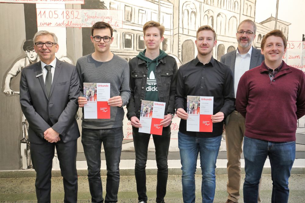 Bei der Preisverleihung waren neben Sparkassen-Filialleiter Thomas Belzer und Schulleiter Thomas Mohr auch Berichterstatter der Rheinpfalz und der PZ anwesend, um die erfolgreichen Börsianer zu interviewen.