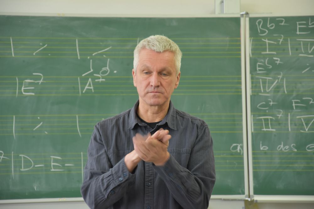 In lockerer Atmosphäre wurden die Schülerinnen von den drei engagierten Mitgliedern des Christof-Heringer-Trios angeleitet und zu ansprechenden Soloimprovisationen motiviert. Eine solche Improvisation erfordert vor allem Mut: Man muss etwas spielen, was nicht in den Noten steht und kann sich lediglich an einem Harmonieschema orientieren. Hauptsache, man traut sich! Der Bassist Matthias Wolf fasste das so zusammen: "Es kann ja sein, dass einem nichts einfällt, aber dann spielt man trotzdem."