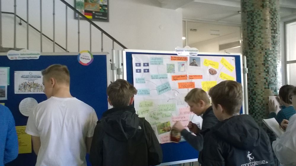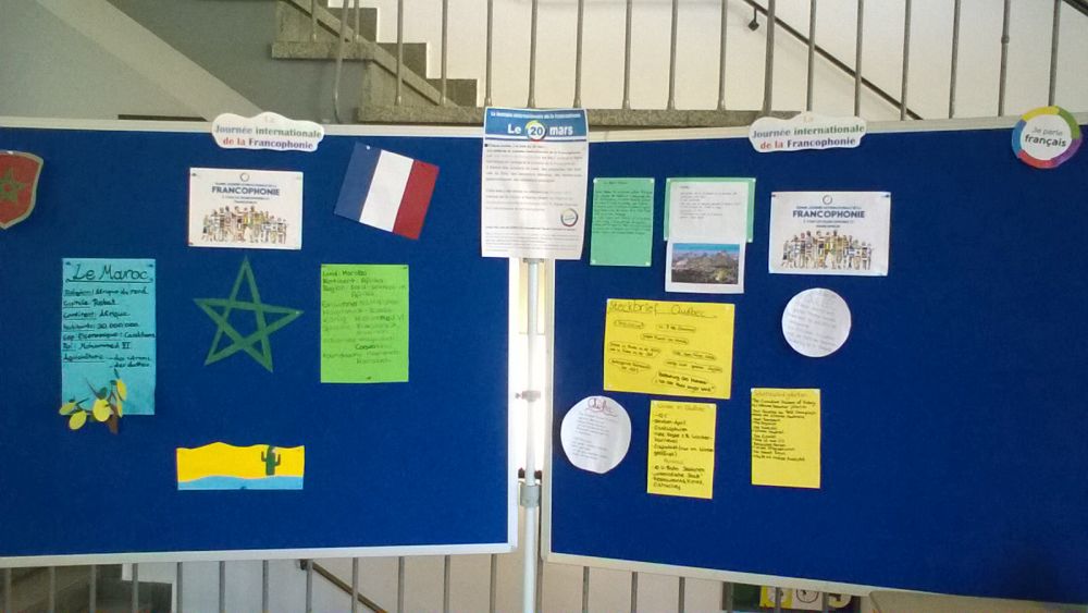 Passend zum sonnigen Wetter gab es bei der Feier zum internationalen Tag der Francophonie viel gute Laune. Diese wurde bereits morgens in den Pausen, in einem, von mehreren Französisch-Klassen schön gestalteten Ambiente, ins Rollen gebracht. Interessierte Schüler und Schülerinnen konnten sich die Pausenzeit bei französischsprachiger Musik (Musik aus den Staaten, welche der Francophonie angehören) auf dem Pausenhof oder in der, mit vielen Plakaten und auch einem Quiz verzierten Aula, vertreiben. Die gute Stimmung wurde dann mittags von dem Französisch Grundkurs der 12ten Klasse weitergetragen. Denn innerhalb des Kurses wurde den Schülern die außergewöhnliche Chance zu Teil, mit einem Burkinabè (einem jungen Mann aus Ouagadougou in Burkina Faso) via Skype zu kommunizieren. Das Gespräch, welches von Frau Spitzer-Weidler organisiert wurde, verhalf zu vielen neuen und aufregenden Erkenntnissen über das Leben in Burkina Faso sowie über Kultur und Politik dieses französischen Bündnisstaates. Zum Highlight des Tages gekürt wurde jedoch das spontan ermöglichte Gespräch mit dem westafrikanischen Topmusiker Bebeto Bongo, welcher sich freudig der interessierten deutschen Klasse, den an ihn gestellten Fragen sowie auch gegenüber seinen Fans zeigte. Nach dem Skype-Telefonat ließen etliche interessierte Schüler und Schülerinnen den Nachmittag bei francophoner Musik, francophonem Essen, sowie auch anderen Schmankerln der francophonen Welt ausklingen.
