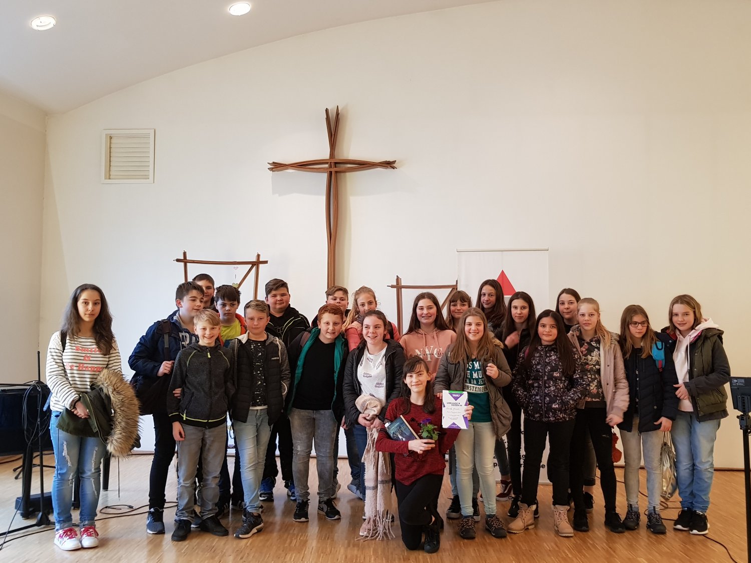 Nachdem sich die Jury ein weiteres Mal beraten hatte, wurden alle Teilnehmer auf die Bühne gebeten und bekamen eine Teilnahmeurkunde und ein Buch überreicht. Die beiden Sieger, Emely Krents und Paul Funk erhielten zusätzlich einen Buchgutschein. Beide dürfen am 27.05. zum Landesentscheid nach Trier, wo sich die zehn besten Leser aus Rheinland-Pfalz