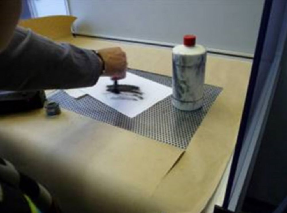 Dann gingen wir in den 6. Stock. Die andere Gruppe tauschte also mit uns. Als wir mit großer Mühe oben ankamen, kam uns Herr Emlich entgegen. Bei ihm lernten wir, wie man einen Finger- und Fußabdruck sichern kann. Wir sicherten die Fingerabdrücke zweier Schüler. Mit UV- Licht kann man unsichtbare Schriften sichtbar machen.