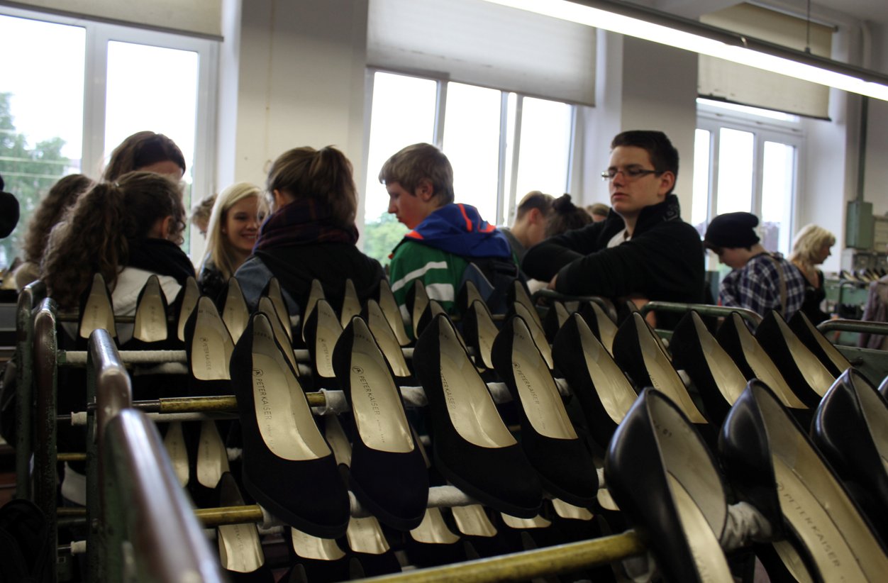 Begrüßt wurden wir herzlich im Lederlager, der Anfang aller dort hergestellten Schuhe. Dort erklärte uns ein Fachmann, welche Arten Leder es gibt und wie das Leder hergestellt und verarbeitet wird. So lernten wir zum Beispiel, dass dort das einfarbige Leder zu 98% durchgefärbt wird, was heißt, dass die Farbenfreude nicht nur von kurzer Dauer ist; auch, dass das bei Peter Kaiser verwendete Tierleder nur aus Abfallprodukten besteht und somit für die Produktion keine Tiere geschlachtet werden müssen.