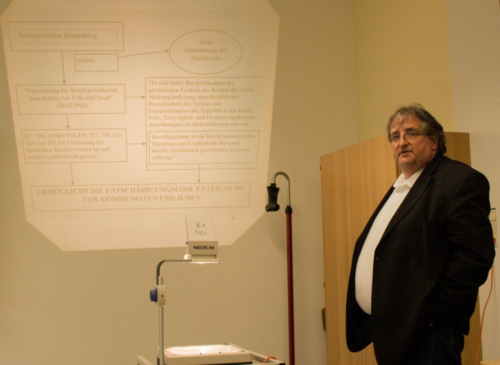 Die Klasse 10a bekam Besuch von dem als Stadtratsfraktionsvorsitzenden der Partei „Die Linke" bekannt gewordenen ehemaligen Leibniz-Schüler Frank Eschrich. Er berichtete uns von seiner Schulzeit am Leibniz zwischen 1974 und 1984, an die er viele gute Erinnerungen habe. Zwar habe er die 8. Klasse wiederholen müssen und während der Oberstufe Ärger durch das Verteilen von Flugblättern bekommen, dennoch erinnere er sich gerne an seine Zeit am Leibniz-Gymnasium und an die „gute Schulgemeinschaft" zurück. Nach seinem Abitur arbeitete Eschrich mehr als 20 Jahre in einem Autohaus, bis er 2009 sein „Hobby zum Beruf machte" und in der Politik aktiv wurde. Heute leitet er die Fraktion seiner Partei im Stadtrat und das Wahlkreisbüro eines Abgeordneten in Kaiserslautern. Außerdem ist Eschrich engagiert im Arbeitskreis „Jüdische Geschichte in Pirmasens", der sich mit dem Holocaust und der Verfolgung der Juden hier in Pirmasens beschäftigt. Hierbei war er als Mitautor bei der Herausgabe des Buches „Die Geschichte der Juden in Pirmasens" beteiligt. Über dieses Buch und seine Tätigkeit im Arbeitskreis erzählte uns Frank Eschrich und visualisierte dies anschaulich durch Folien und Auszüge aus seinem Buch.