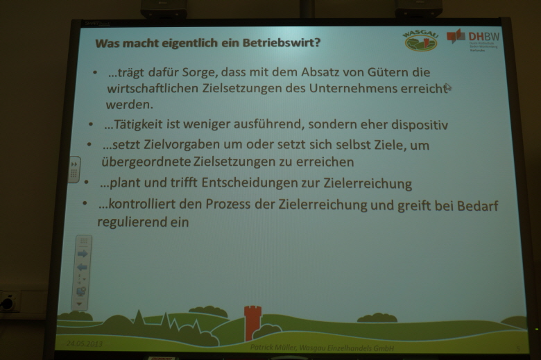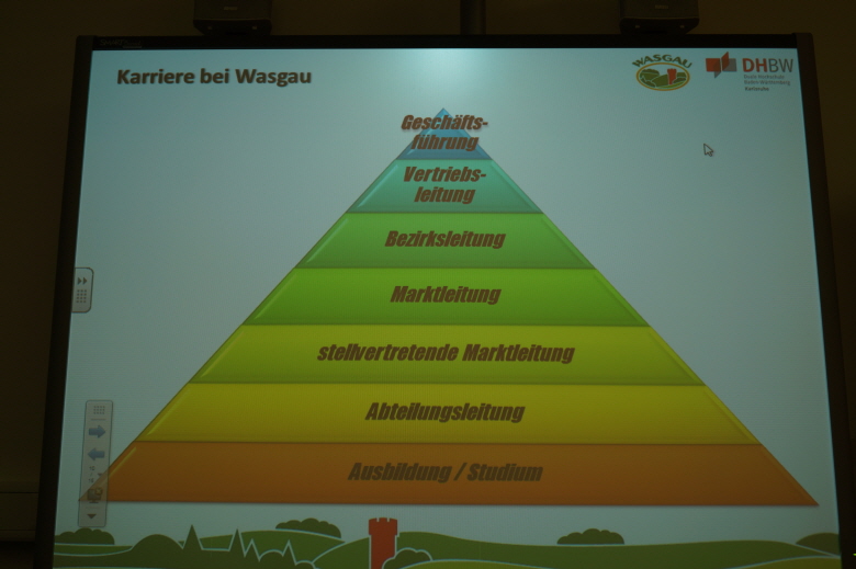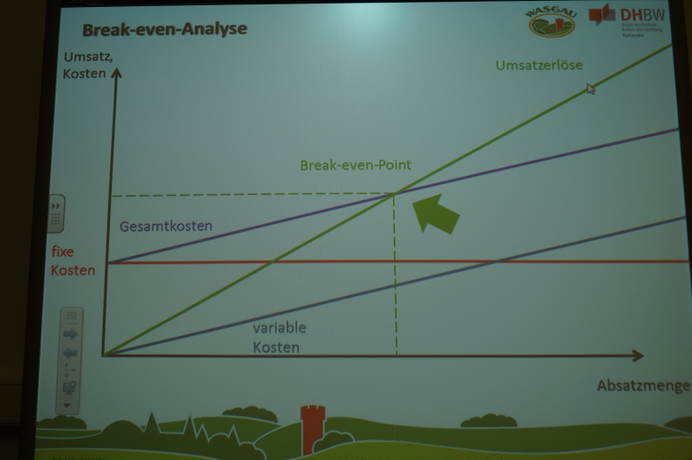 Zuerst erklärte er uns anhand eines Beispiels, nämlich der Eröffnung eines Bratwurststandes, BWL, was er mit Hilfe einer Break-Even-Analyse verdeutlichte. Dann erzählte er uns etwas über seine Arbeit als Marktleiter in der Wasgau und seine weiteren Lebensziele.