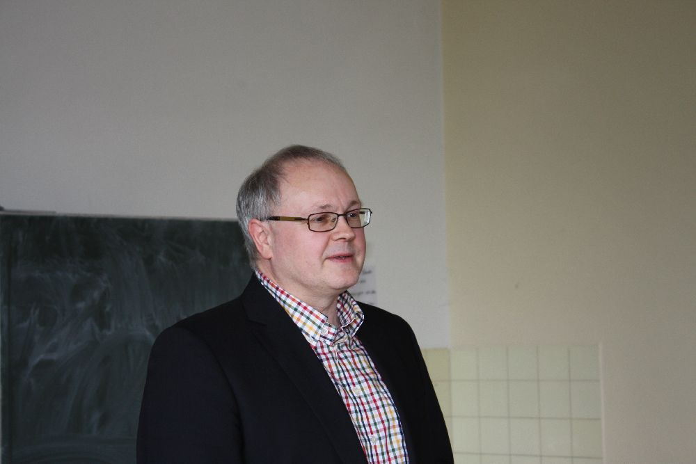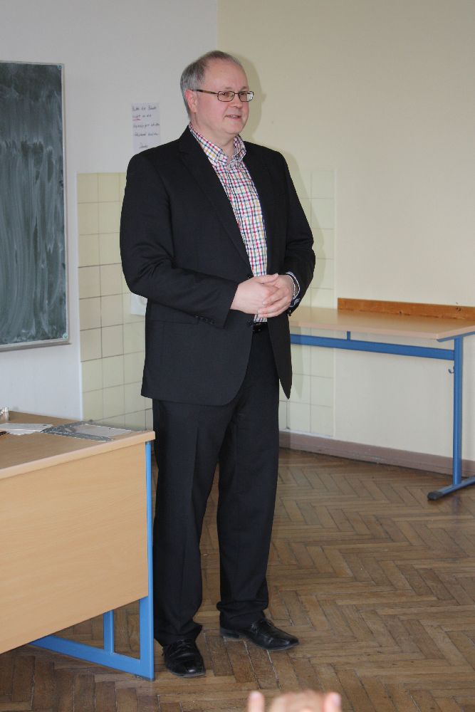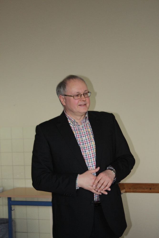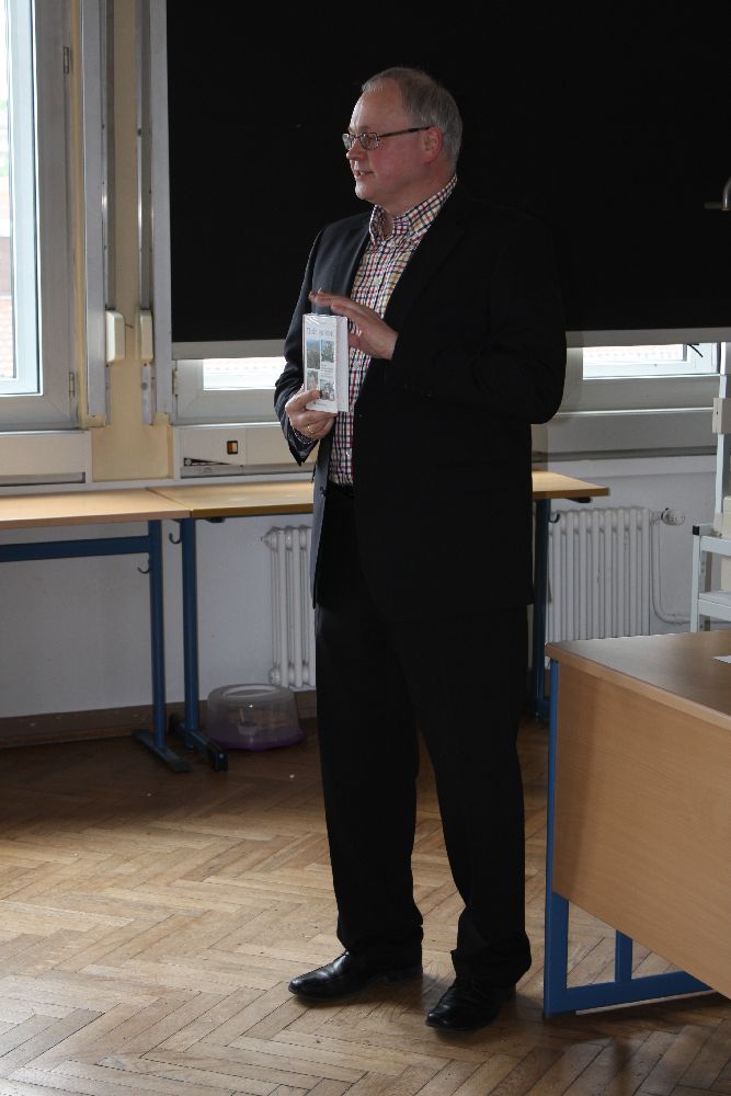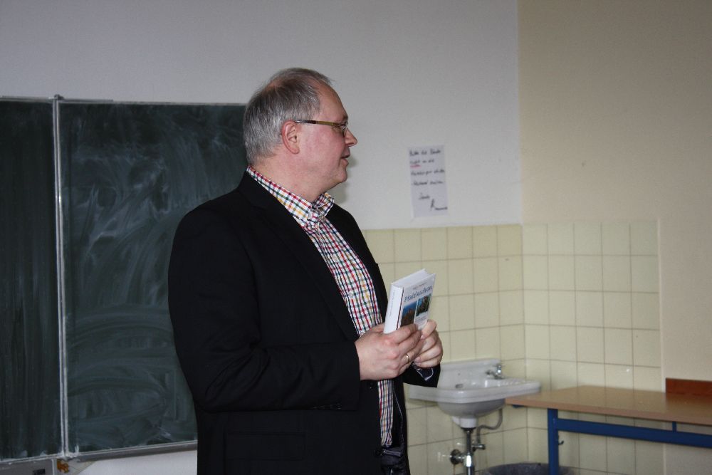 Nach einem kurzen Bericht über seine Schulzeit an unserer Schule, bei dem er uns auch ein Klassenfoto aus dieser Zeit gezeigt hatte, informierte er uns über seinen weiteren beruflichen Werdegang: Nach dem Abitur machte Herr Cronauer eine Ausbildung bei der AOK und arbeitete anschließend auch für die Pirmasenser Zeitung und im Radiostudio Bitch. In dieser Zeit hat er aufgrund seines großen Interesses für die Pfalz damit angefangen, sein persönliches Handbuch mit Informationen über die Pfalz anzulegen, aus dem sich dann im Laufe der Zeit ein umfangreiches Nachschlagewerk entwickelte, das heute unter dem Titel „Jürgen Cronauer's Pfalzlexikon" im Verlag Arbogast erschienen ist.