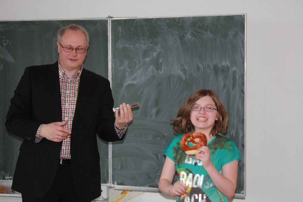 Auch unsere Klasse profitierte von Herrn Cronauers Wissen über die Pfalz, das er uns auf spielerische und lustige Weise vermittelte: Er verschaffte uns z.B. einen Überblick über die wichtigsten Städte der Pfalz und deren Einwohnerzahlen und informierte weiterhin auf spielerische Art und Weise über Produkte aus der Pfalz, die heute weltweit bekannt sind, indem er diese von Schülern mit geschlossenen Augen „erschmecken" ließ, was natürlich nicht ohne Lachen der Mitschüler und Eltern geschah. Unter den Produkten waren z.B. der Wawi Schoko-Reis oder eine Brezel, deren Name vom lateinischen Wort brachium (Arm) abgeleitet wird.