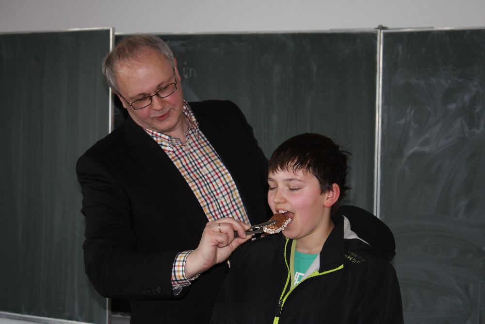 Damit unsere Klasse an diesem Tag nicht hungrig nach Hause gehen musste, hatte Herr Cronauer von allen vorgestellten Produkten genügend für die Schüler und Eltern der Klasse zum Essen mitgebracht. Zum Abschluss seines interessanten Vortrages schenkte er der Klasse ein Exemplar seines Pfalzlexikons, das er Frau Weiß überreichte. Frau Weiß bedankte sich im Gegenzug bei Herrn Cronauer mit Pralinen, die übrigens aus unmittelbarer Nachbarschaft der Schule stammen.