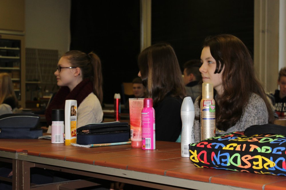 Prof. Dr. Stein ist tätig an der Hochschule RheinMain FB Ingenieurwissenschaften SB Umwelttechnik. In einem anschaulichen und informativ gestalteten Unterrichtsgespräch erfuhren die Schüler, warum das Lüften von Klassenzimmern während der Unterrichtsstunden notwendig ist und wie wichtig es ist, auf deklarationspflichtige Duftstoffe in Kosmetikartikeln zu achten, da diese zum Teil für das Auslösen von Allergien verantwortlich sein können.