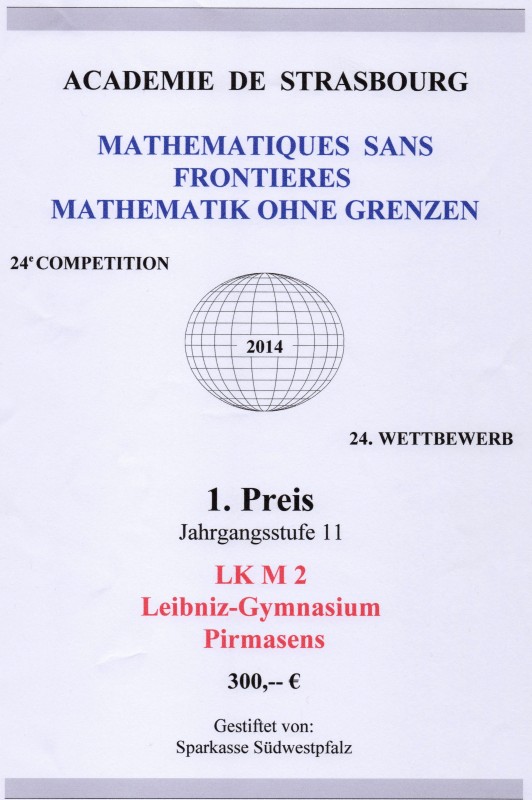 Am 11. März nahmen die Klassenstufen 10 und 11 aller Gymnasien der Süd-Südwestpfalz und des französischen Elsass sowie die Internationale Schule in Brüssel am Mathematikwettbewerb "Mathematik ohne Grenzen" teil. Der Mathematik Leistungskurs von Frau Laux sowie der Mathematik Grundkurs von Herr Jessl wurden anschließend zur Preisverleihung am 6. Mai nach Wörth eingeladen.