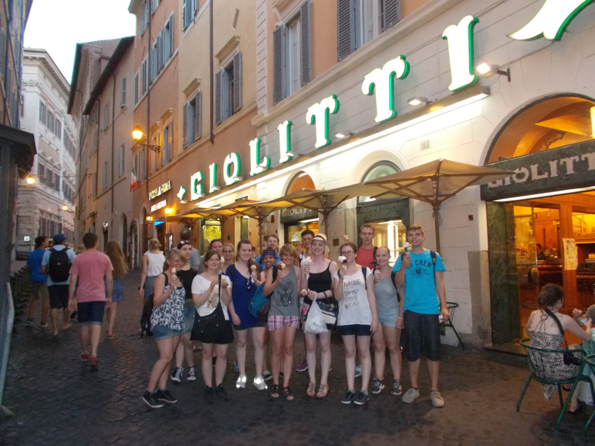 „Permesso!" , ein römischer Zauberspruch, der einem in der U-Bahn oftmals das Leben retten kann. Nur mit ihm kann man sich den Weg durch die überfüllten Züge und Busse bahnen und schließlich an der richtigen Stelle aussteigen. In unserem Fall war dies zuerst die Station Termini, zu der wir mit einem Shuttlebus vom Flughafen angereist waren (wo wir übrigens volle 2 Stunden auf unsere Koffer warten mussten). Von Termini aus schleppten wir unser Gepäck zu Fuß eine halbe Stunde lang zu unserem Hotel am Piazza Portomaggiore. Nach einer kurzen Verschnaufpause machten wir uns auf, die ewige Stadt zu erobern. Auf unserem Plan standen an diesem Abend der Piazza del Popolo, der Monte Pincio (mit tollem Ausblick über die Stadt) und die Spanische Treppe. Danach ließen wir den Tag mit einem Eis von der „besten Eisdiele Roms" (O-Ton Herr Lutz) ausklingen, welches er uns freundlicherweise bezahlte. Grazie ;).