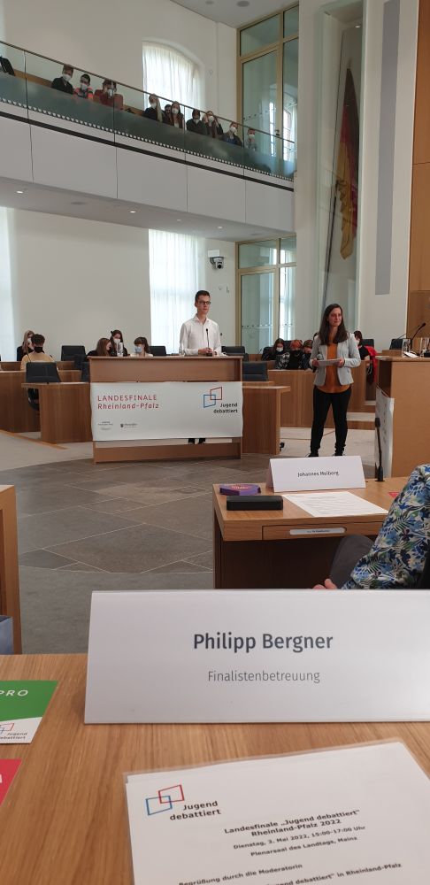 Am 03.05.2022 fand in Mainz der Landeswettbewerb Jugend debattiert statt. Nachdem sich Felix Stein (MSS 11) bereits auf Schul- und Regionalebene durchsetzen konnte, errang er mit einer hervorragenden Debattenleistung nun auch den Landessieg. Als Belohnung winken ihm die Teilnahme an einem 5-tägigen Rhetorik-Seminar für Landessieger und die Weiterleitung zum Bundeswettbewerb in Berlin.