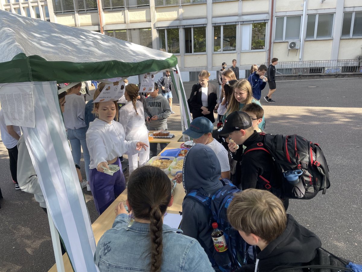 Bei einem gemeinsamen Brainstorming wurde ein wöchentlicher Kuchenverkauf beschlossen, an dem jeder Kurs, jede Klasse und jede AG teilnehmen konnte. Der Zuspruch war groß und die Liste mit den Daten binnen weniger Tage voll, sodass teilweise sogar zweimal in einer Woche verkauft wurde. So gelang es unserer Schulgemeinschaft seit Mai 1451 € zu sammeln. Den aufgerundeten Betrag von 1500 € konnten wir am 21.07. an den Förderverein Medizinische Krisenhilfe Pirmasens e.V. am Krankenhaus in Pirmasens spenden, welcher mit ukrainischen Ärzten zusammenarbeitet, sodass die Hilfe ohne Umwege ankommt.
