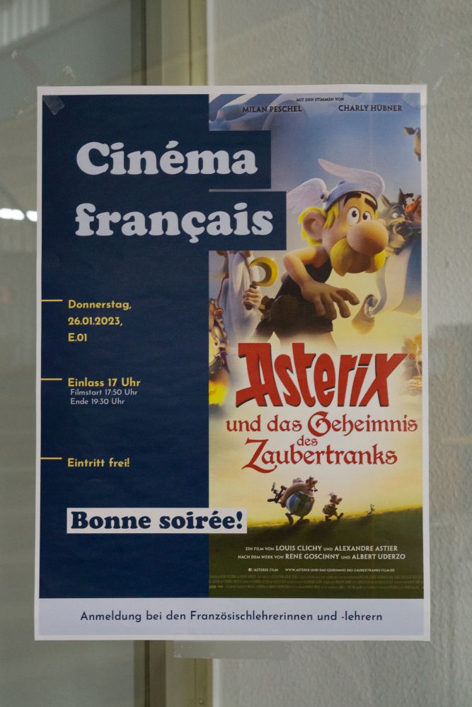 Am 26.01.2023 war es endlich soweit: „Le cinéma français" fand statt. Das französische Kino begrüßte alle 6-8. Klässler mit offenen Armen, um ihnen die Möglichkeit zu geben, etwas französische Kultur auch hier am Leibniz-Gymnasium zu erfahren. Um 17 Uhr versammelten sich alle Schüler, um das französische Kulturgut, nämlich Crêpes und Orangensaft, zu kosten. Bei den Crêpes standen Nutella sowie Zimt und Zucker zur Auswahl. Die Crêpe- sowie die Orangensaft-Vergabe löste große Begeisterung bei den Kinobesuchern aus, weshalb sich der Beginn des Filmes um eine Viertelstunde nach hinten verschob. Doch dann, gegen 18 Uhr, begann der Film „Astérix et Obélix", wo sich der „Kinosaal", Raum E-01, immer weiter füllte. Mit großer Begeisterung sowie Aufmerksamkeit folgte das Publikum der Handlung des Filmes. Als sich der Film gegen 19:30 Uhr letztendlich zum Ende neigte, versammelten sich die ersten Eltern, um ihre Kinder von dem ereignisreichen Abend abzuholen.