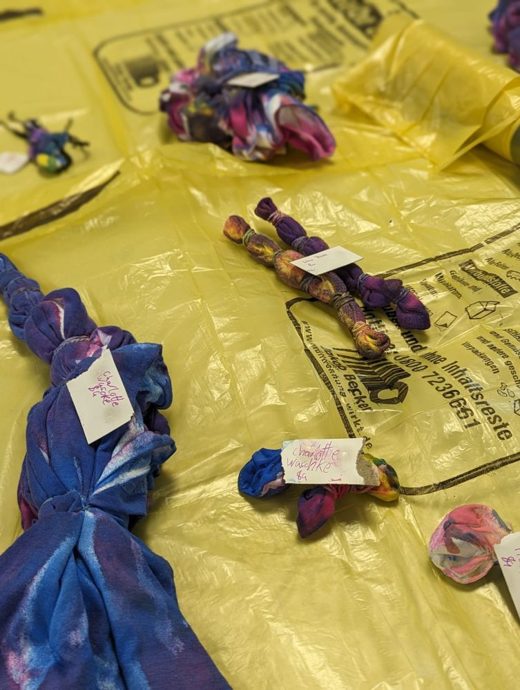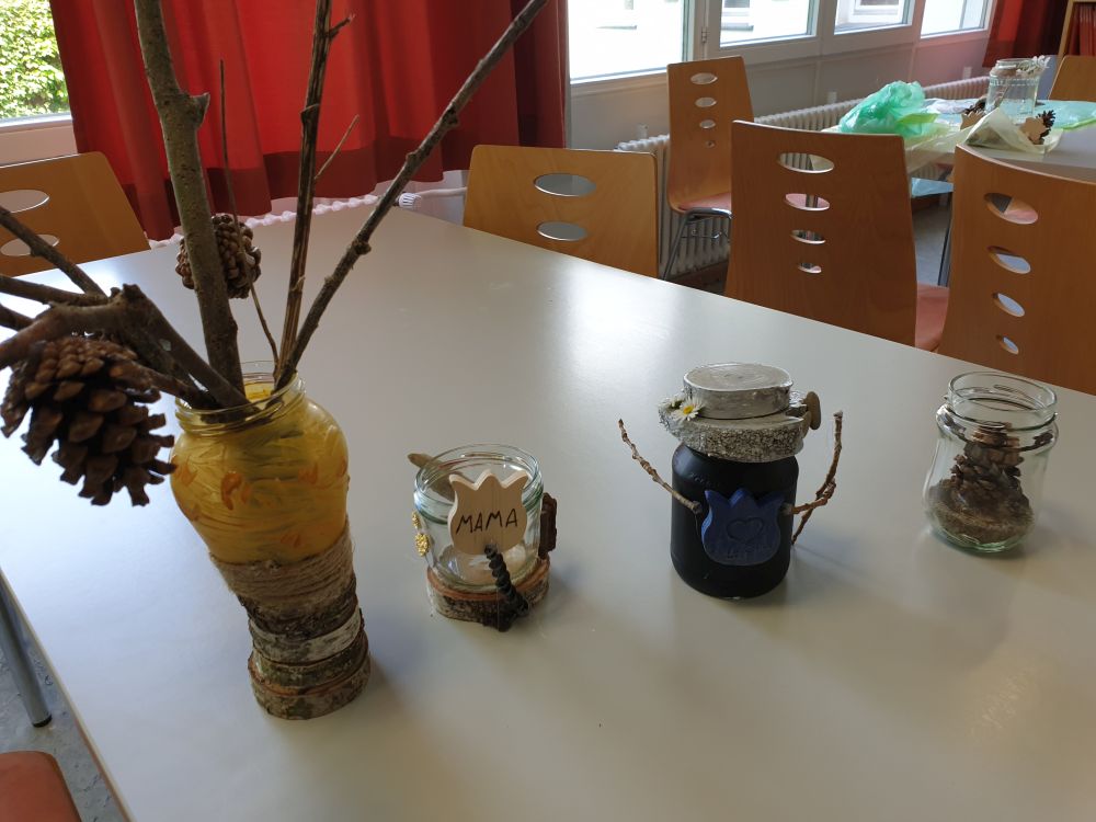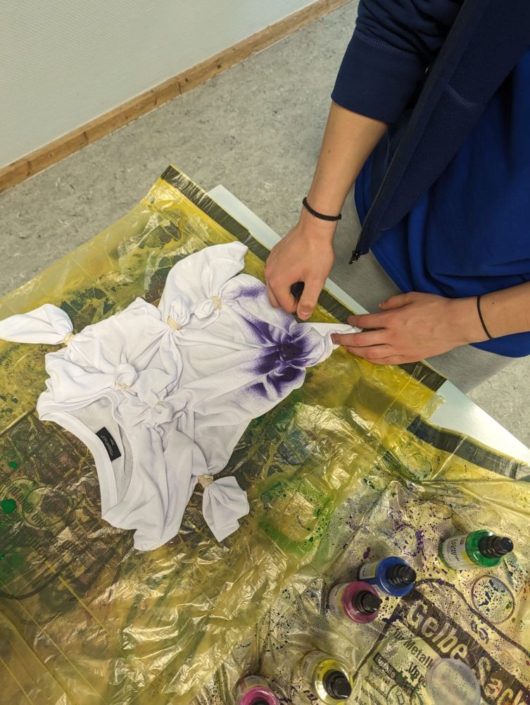 Um 14 Uhr trafen wir uns dann wieder an der Jugendherberge, um weitere Aktivitäten zu erledigen. Langweilig wurde uns nie! Die Mädchen der 8C machten den Teig für das Stockbrot, welches wir am Abend grillten. Die Jungs schlugen im Wald die Haselnussstecken dafür. Währenddessen war die 8B beim Bogenschießen und musste im Wald bestimmte Sachen sammeln, wie etwas Spitzes, etwas, das wie eine Schlange aussieht, etwas mit Zähnen und so weiter. In dieser Zeit hat die 8A beim Upcyclingprojekt mit alten mitgebrachten Gläsern gebastelt. Daraus konnte man Windlichter oder auch Mutter- oder Vatertagsgeschenke machen. Dazu wurden Blumen, Treibholz aus dem Rhein, Sprühfarben, Gräser und Metallstücke vom Schrottplatz benutzt. Alle Workshops gingen dann über in ein kreatives Projekt, bei dem Haargummis und selbst mitgebrachte Kleidungsstücke wie T-Shirts oder Socken gebatikt wurden. Entweder hat man seine Kleidungsstücke nach dem Eindrehen und festbinden mit Farbe angesprüht, oder man hat alles in Farbe eingelegt. Einen Tag später konnte man das fertige Kunstwerk abholen. Bis zum Abendessen um 18 Uhr hatten wir noch freie Zeit auf dem weitläufigen Gelände der Jugendherberge.