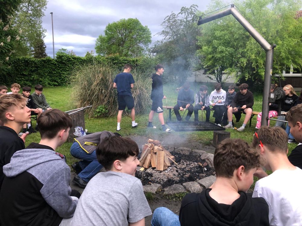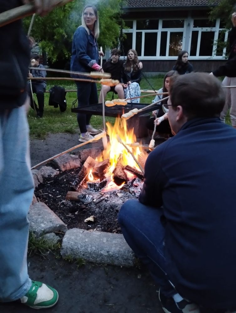 Das Abendessen bestand aus einem Büffet mit Nudeln, Soßen und vor allem viel Gemüse. Es war also für jeden etwas dabei. Nach dem Abendessen und einer kleinen Ansprache hatten wir noch mal kurz frei. Danach ließen wir den ersten Tag mit dem Grillen von Stockbrot über dem Lagerfeuer, Musik, Spielen und geselligem Beisammensein ausklingen. Ab 22 Uhr war Bettruhe und alle sind sehr müde ins Bett gefallen.