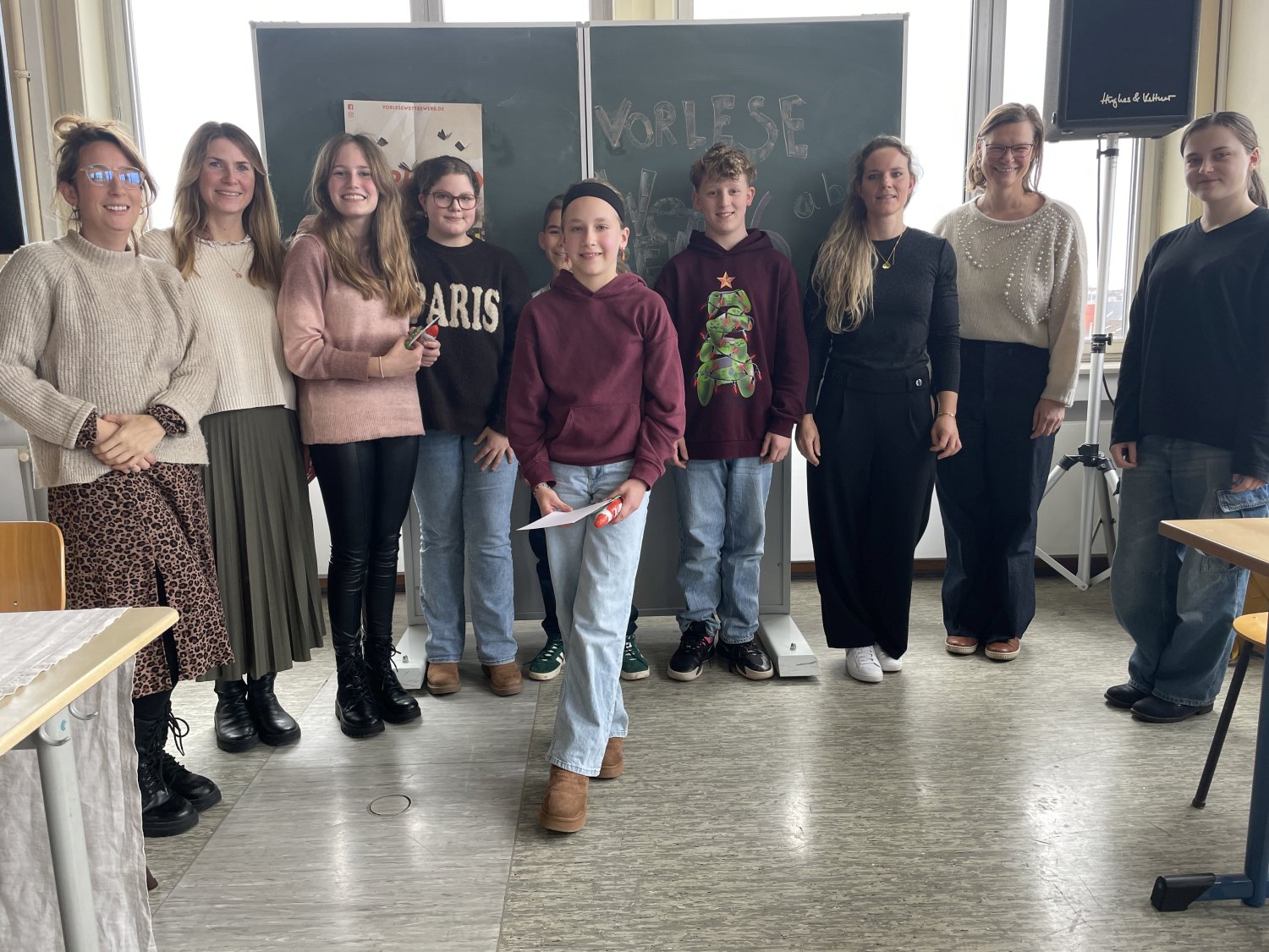 Am 02. Dezember 2025 war es soweit. Die vier Klassensieger*innen der sechsten Klassen kamen im Beisein all ihrer Mitschüler*innen und unseres Schulleiters Herr Mohr im großen Musiksaal zusammen. Dort präsentierten sie ihr Lese-Können, um den Schulsieger/ die Schulsiegerin zu ermitteln.