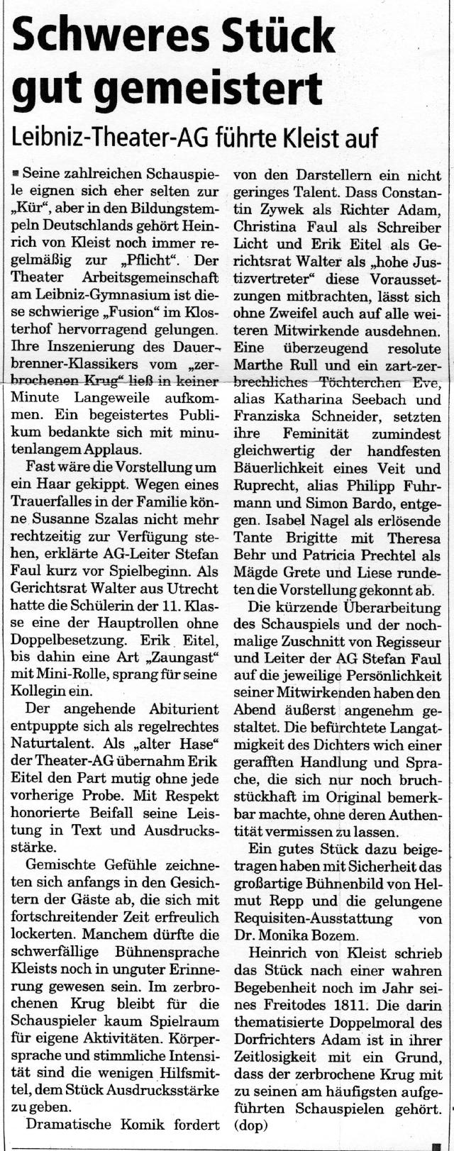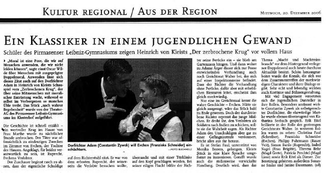 Nach wahrer Begebenheit schrieb Heinrich von Kleist vor fast zweihundert Jahren das Schauspiel „Der zerbrochene Krug".