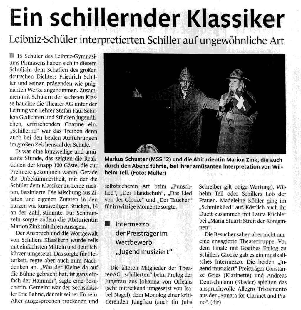 Die Theater-AG und die Klasse 6a bieten einen unkonventionellen Spaziergang entlang der kanonischen Schillertexte, angereichert mit charmantem Spott und erheiternden Perspektiven.