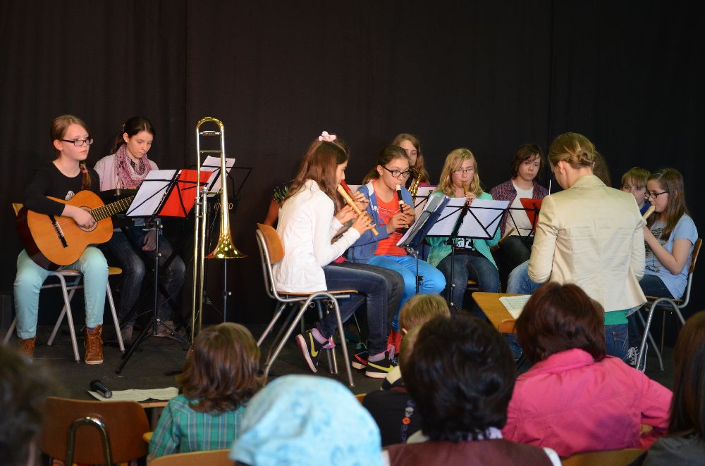 Nicht vergessen werden darf bei den Aufführungen die Instrumental-AG, die die Abende mit zwei Stücken musikalisch einleitete. Immer wieder gelingt es dabei Frau Breum, aus einem eher untypischen Instrumentarium (Blockflöten, Klavier, Keyboard, Saxophone, Posaune, Gitarre, Gesang und Schlagwerk) einen ansprechenden Orchesterklang zu formen und aktuelle Songs einzustudieren und überaus ansprechend aufzuführen.