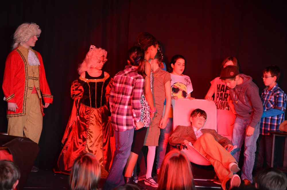 Die Musical-AG spielte mit viel Engagement und Können die Geschichte über den Ur-Ur-(...)-Enkel von Leibniz, der zu seinem 75. Geburtstag mit allerlei Geschenken überrascht werden soll, von denen er selbst überhaupt nichts hält.