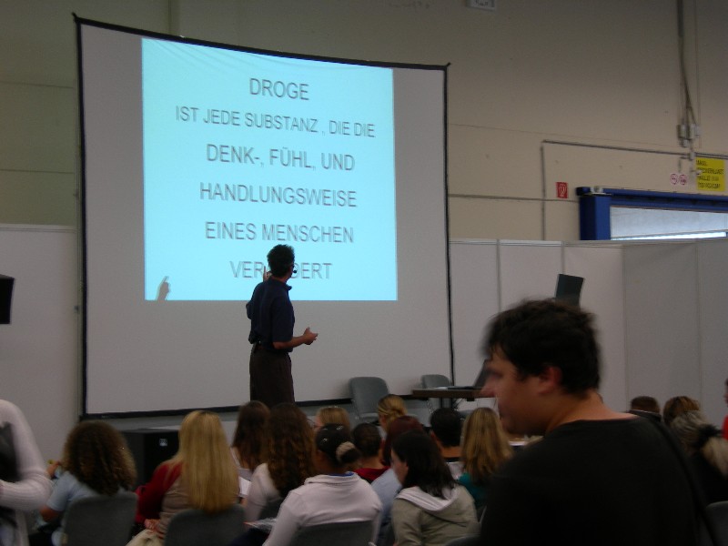 Einen ebenfalls interessanten Beitrag lieferte Dr. Sachtleben, ein Allgemeinmediziner, mit dem Thema "Drogen sind cool - oder?" Er erklärte, dass jede Substanz, die Denk-, Fühl- und Handlungsweise verändert, eine Droge sei. Er zog als Beispiel Canabis heran, eine Droge, die entspannt, jedoch die geistige und körperliche Leistung senkt. Nach einem Joint ist man 24-28 Stunden verkehrsunfähig und bei täglichem Genuss ist dies noch nach drei Monaten nachweisbar. Zur Debatte steht momentan die Legalisierung von Canabis, da bei der Beschaffung auf dem Schwarzmarkt die Abhängigen noch schneller bei den harten Drogen angelangen. Es bleibt jedoch zu bedenken, dass die Verkehrsfähigkeit nicht mehr gegeben ist.