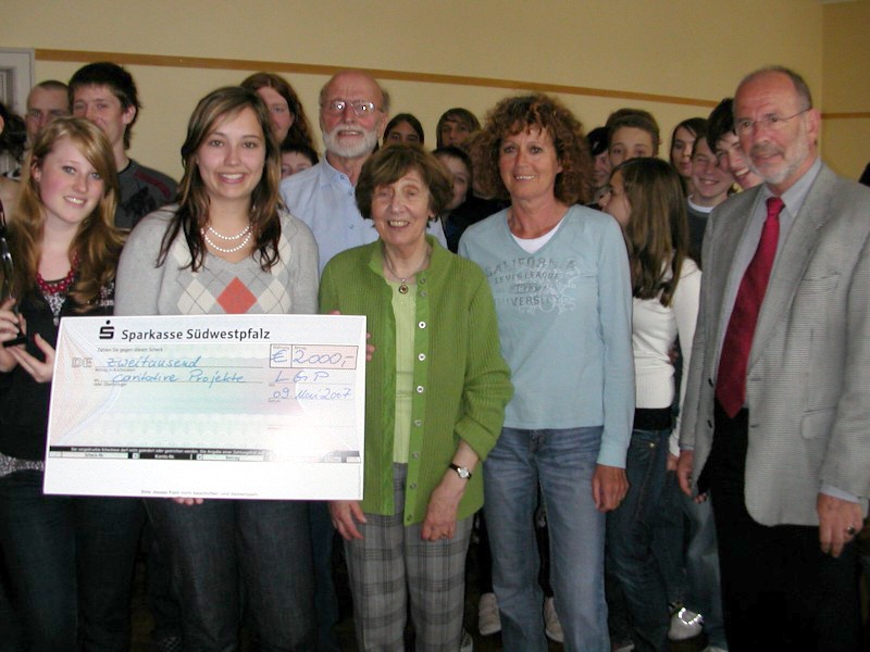 Bei einer improvisierten Klassensprecherversammlung übergab Schülersprecherin Jasmin Slabowski für die SV traditionell einen Scheck als Spende an insgesamt vier dem Haus vertraute caritative Institutionen. Der Erlös des Winterfestes war von der SV auf den Betrag von 2000 Euro aufgerundet worden. Organisiert worden war die Übergabe von Herrn Faul und Frau Vehling. Die Vertreter(innen) der bedachten Institutionen stellten ihre Projekte kurz vor und berichteten über die geplante Verwendung der Spende: Frau Hollinger von der Frauengruppe St. Pirmin (Hilfe für Ruanda), Herr Hemmer (Ausbildungszentrum in Togo) und Frau Andreas von der Pfarrei St. Elisabeth (Landwirtschaftsschule in Brasilien). Dr. Markus Merk, vielbeschäftigter Schiedsrichter aus Kaiserslautern, von der Indienhilfe ließ sich diesmal von Schulleiter Herr vertreten.