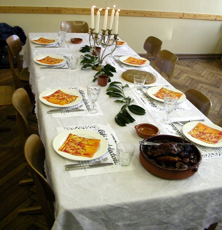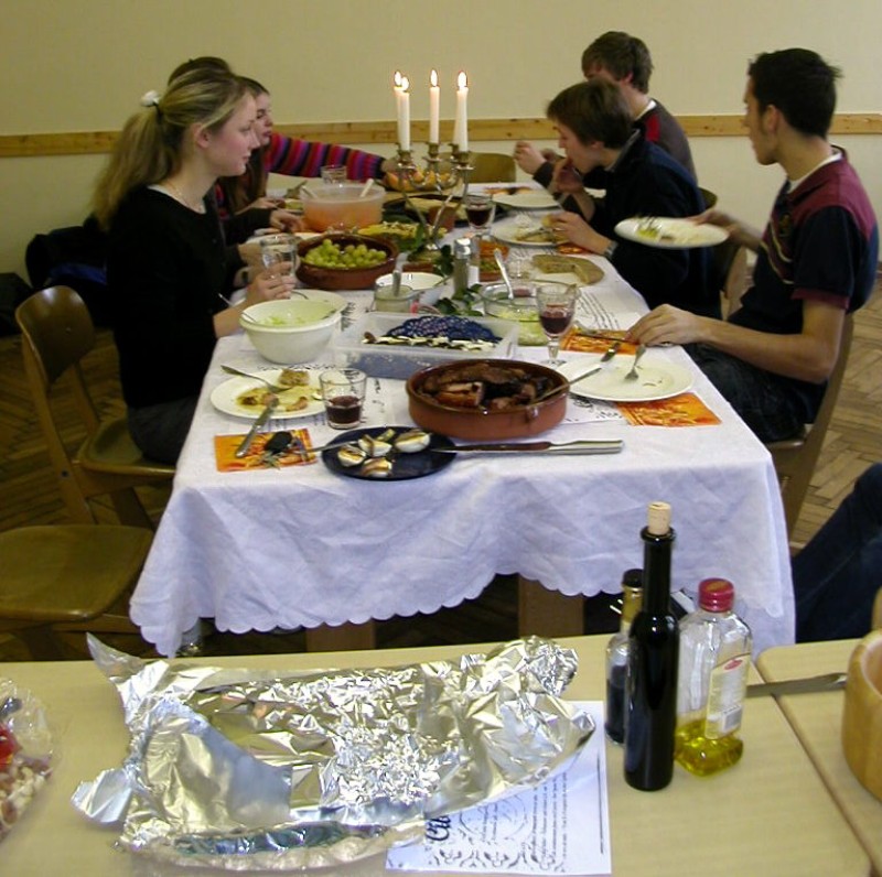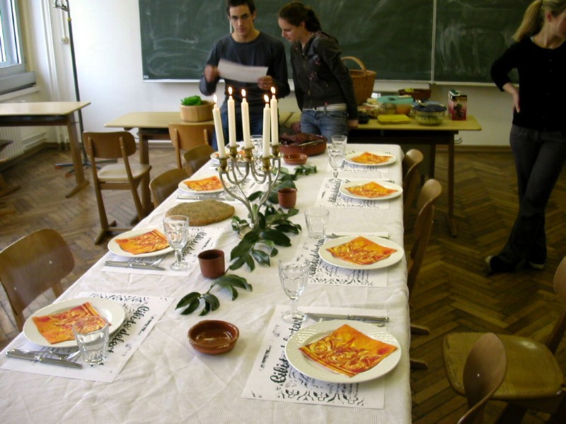 In Anlehnung an die Vox-Sendung "Das Perfekte Dinner" entschlossen wir - die Lateinschüler der 13. Jahrgangsstufe - uns, ein besonderes Dinner bzw. Gastmahl nach römischer Art für uns selbst zuzubereiten. Dafür suchten wir im Vorfeld mit Frau Gottert Rezepte aus dem alten Rom aus und stellten eine komplette Cena zusammen - ab ovo ad mala, von der Vorspeise bis zur Nachspeise. Natürlich sollte sie auch in (relativ) römischem Ambiente stattfinden. Am 14.12.2006 war es dann im Anschluss an die 6. Stunde soweit: