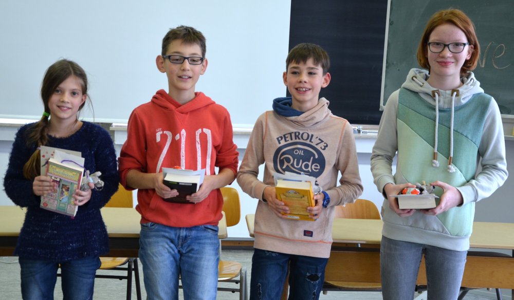 Am 05. Dezember 2016 fand der jährliche Vorlesewettbewerb der 6. Klassen am Leibniz-Gymnasium statt. Dabei traten die vier Klassensieger (Leonie Knecht 6a, Luca Heckmann 6b, Marvin Dully 6c und Frida Merk 6d) im Vorlesen gegeneinander an. Während jeder Kandidat in der ersten Runde einen von ihm eingeübten Text vorlesen durfte, mussten die Teilnehmer in der zweiten Runde eine ihnen unbekannte Passage aus dem Jugendbuch „Mit Jeans in die Steinzeit“ von Wolfgang Kuhn vorlesen. [Mehr...]