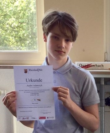 Beim Landeswettbewerb Sekundarstufe I für Gymnasien und Integrierte Gesamtschulen in Rheinland-Pfalz „Durchblick mit Physik" erzielte André Adamzyk in der 1. Runde den 3. Platz und qualifiziert sich somit für die 2. Runde. [Mehr...]