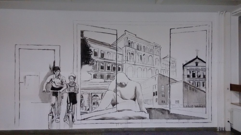 Frau Marie Gouil, eine unserer Kolleginnen im Fachbereich Bildende Kunst, führte ihre Arbeit an der Fassade des Leibniz mit einem weiteren Wandgemälde fort - jetzt im Innenbereich. Schauen außen Schülerinnen und Schüler der Neuzeit auf das aktuelle Schulgebäude herab, so sind es innen die Schülerinnen und Schüler der vergangenen Zeit, die dem Betrachter entgegen kommen.