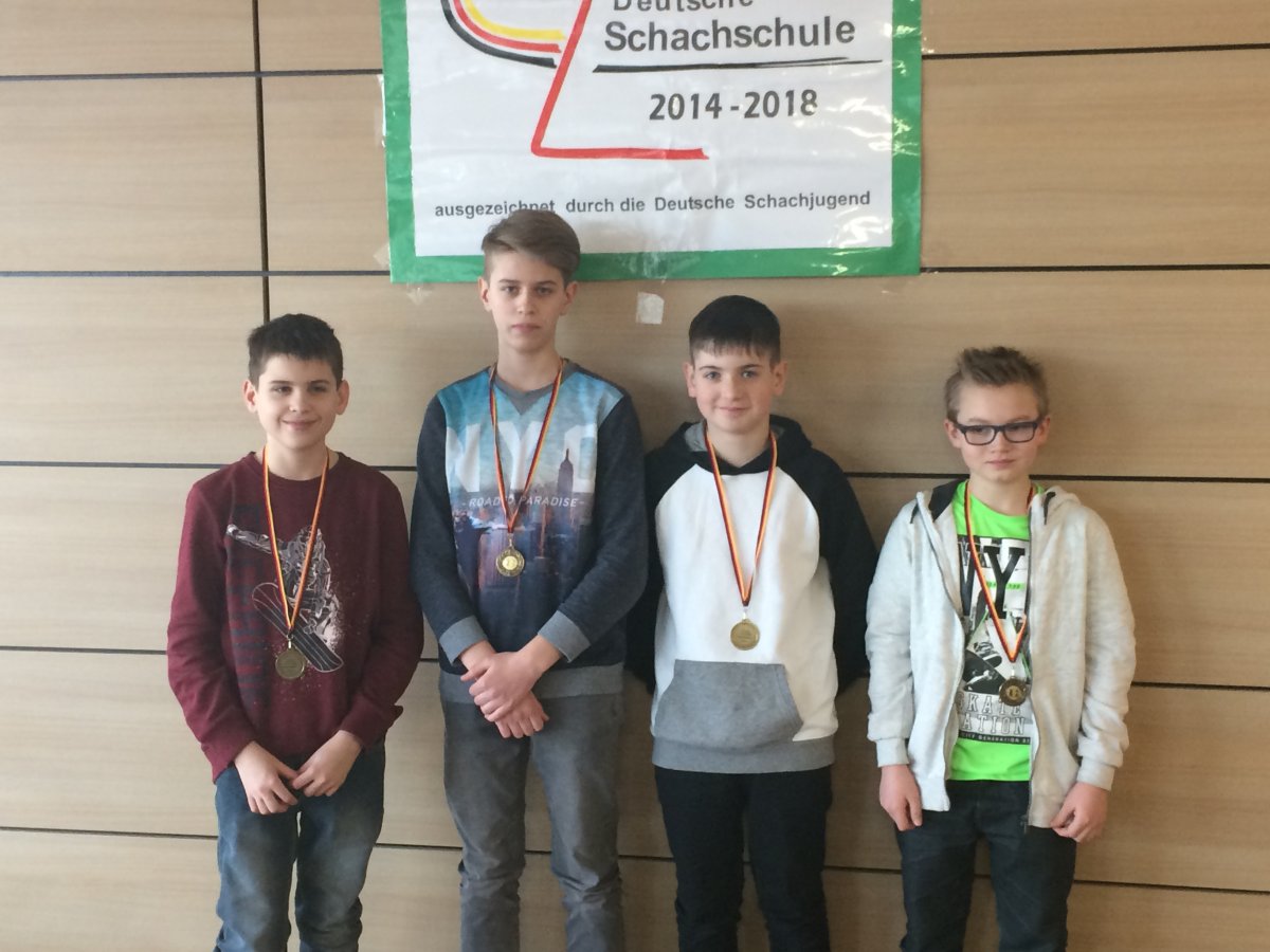 Erstaunliches gelang der U13-Mannschaft in der Wettkampfklasse IV: Die vier Leibnizianer Yannick Groh, Sebastian Kraus, Felix Bohl (alle 7d) und Tim Gebhard (5a) spielten in den ersten fünf Runden so, dass die Mannschaftskämpfe jeweils mit einem 2:2-Unentschieden endeten. Keine andere Mannschaft im Turnier holte so viele Punkteteilungen. Dann folgte in Runde 6 endlich der heißersehnte Sieg, worauf man allerdings das gleiche Schicksal wie „die Großen" erlitt und gegen den Tabellenersten die einzige Niederlage einstecken musste.
