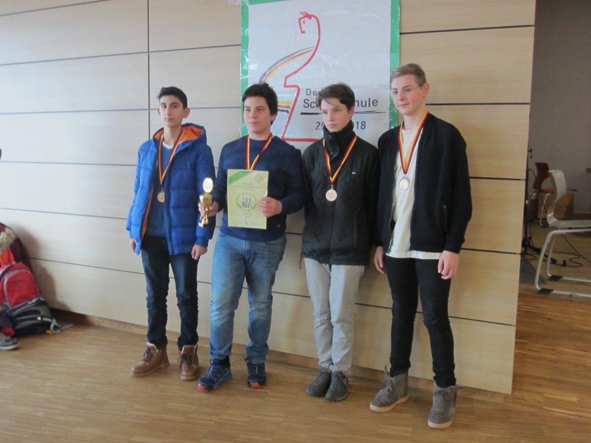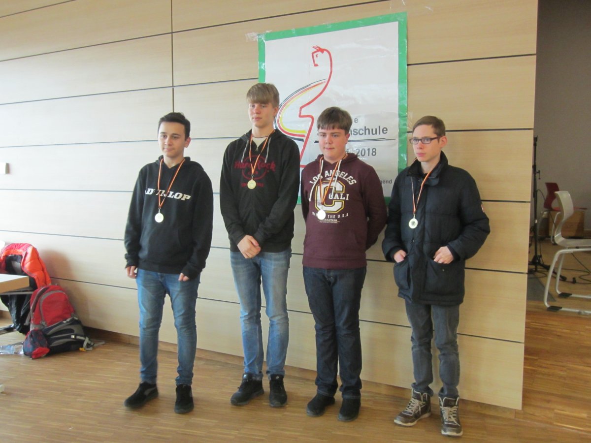 Ein besonderer Erfolg ist sicherlich der dritte Platz des Teams „Leibniz 1" in der Wettkampfklasse III (bis 15 Jahre). Die Mannschaft bestehend aus Moritz Stein (8a), Lewon Harutyunyan, André Adamczyk und Cornelius Bergweiler (alle drei 8b) landete durch hervorragende Leistungen am Ende auf dem Treppchen: Platz 3 von 22 Mannschaften ist schon beachtlich, vor allem wenn man bedenkt, dass die Spieler um Mannschaftsführer Moritz Stein (Klasse 8a) allesamt tatsächlich nur in der AG und nicht im Verein trainieren.