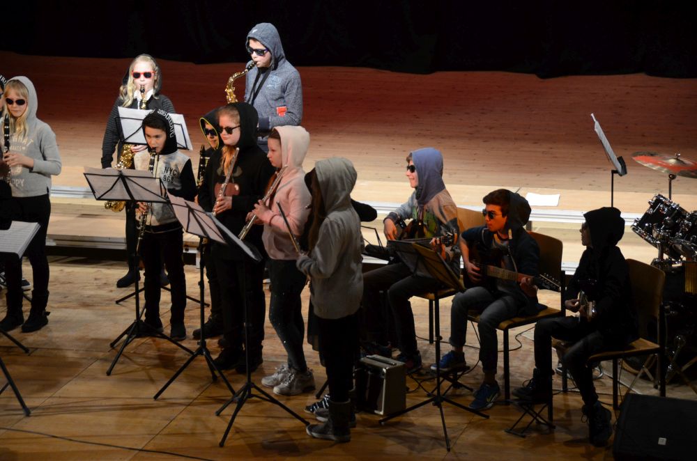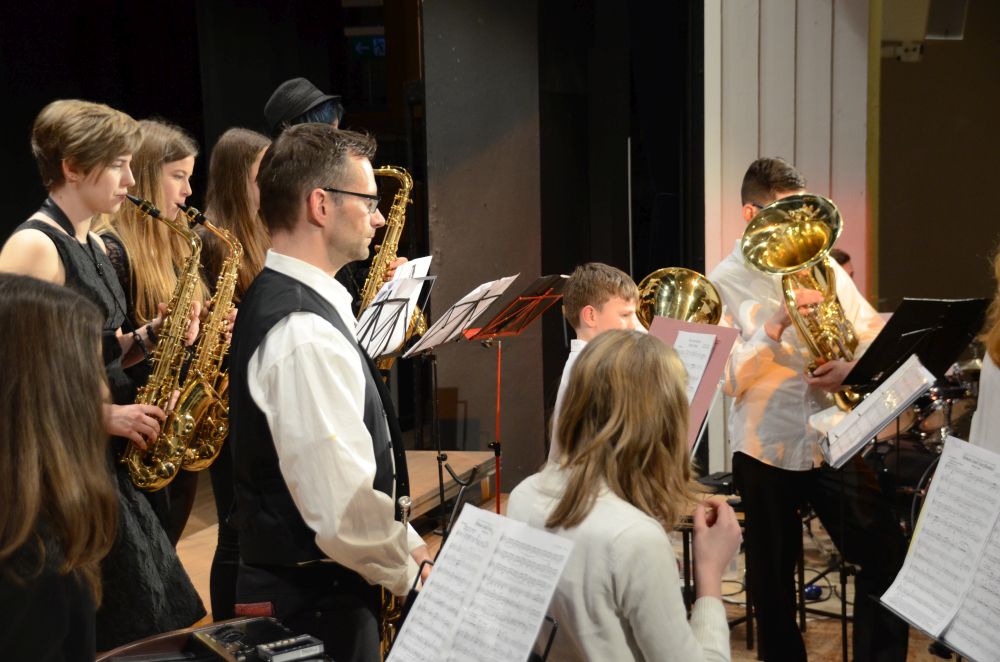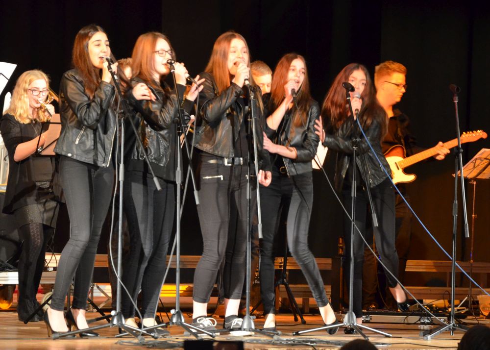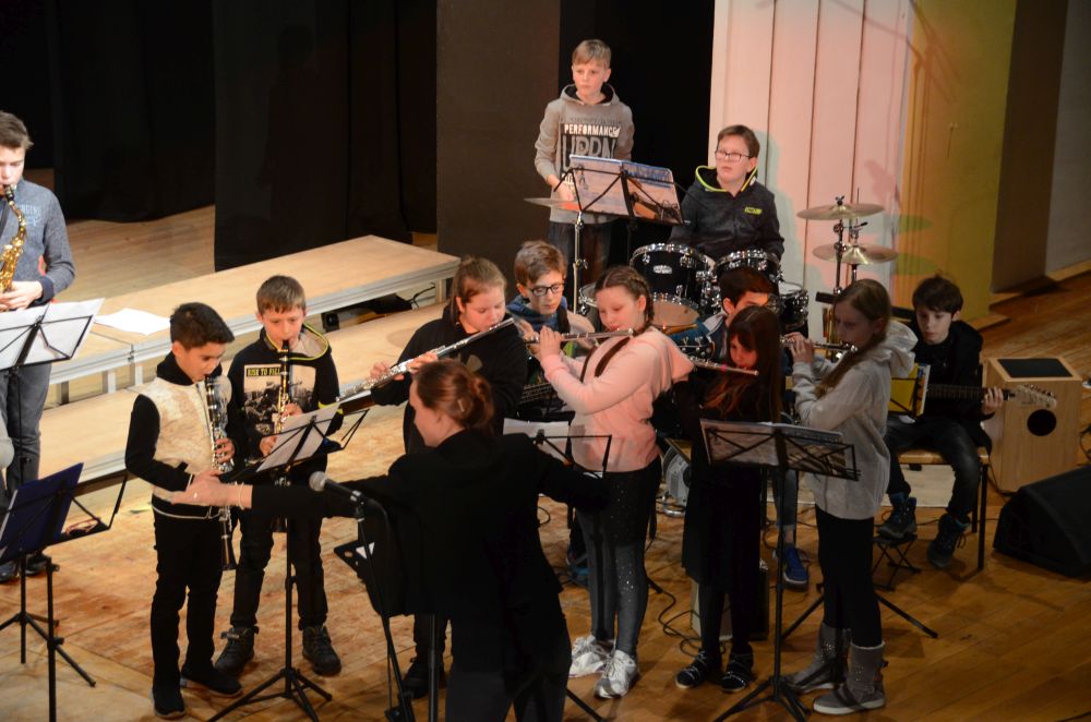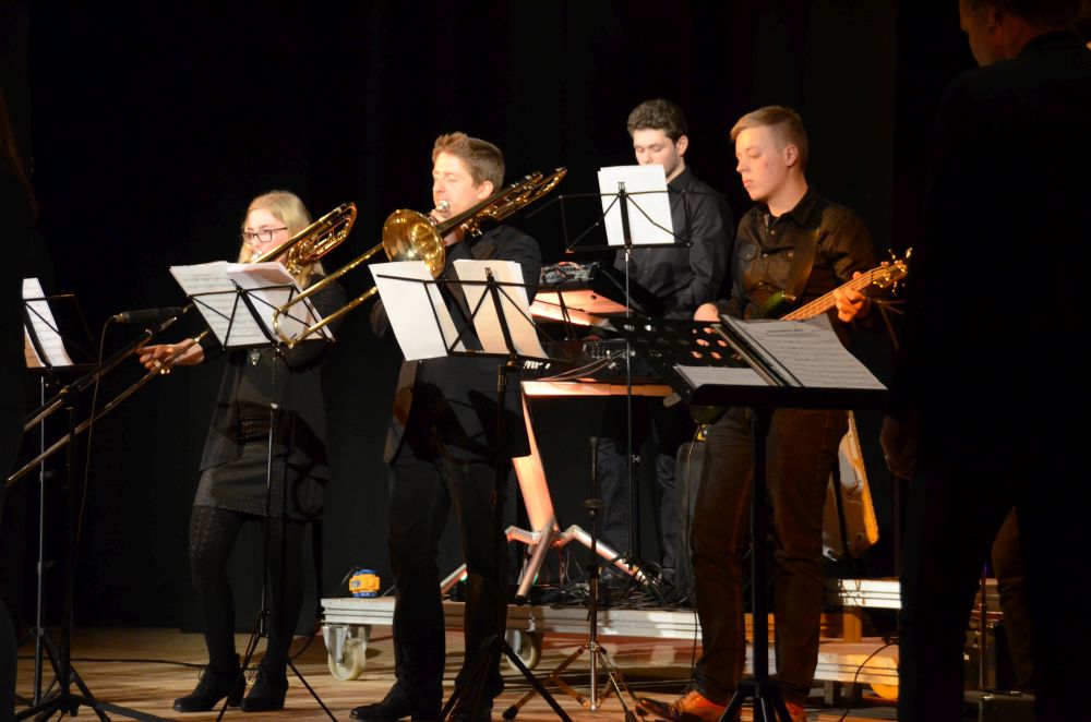 Direkt am Anfang des Abends stand die große, mit Spannung erwartete Premiere der Big-Band-Klasse. Dieses im Schuljahr 2016/2017 erstmals an unserer Schule realisierte Projekt ermöglicht es Schülerinnen und Schülern der 5. und 6. Klassen ein Instrument zu erlernen und das Zusammenspiel im Klassenverband zu trainieren. Nicht nur die sichtbare Spielfreude der rhythmisch wie dynamisch starken Truppe, sondern auch die nach den Neuanmeldungen garantierte Fortsetzung im nächsten Schuljahr bestätigen den Erfolg dieses Projekts.