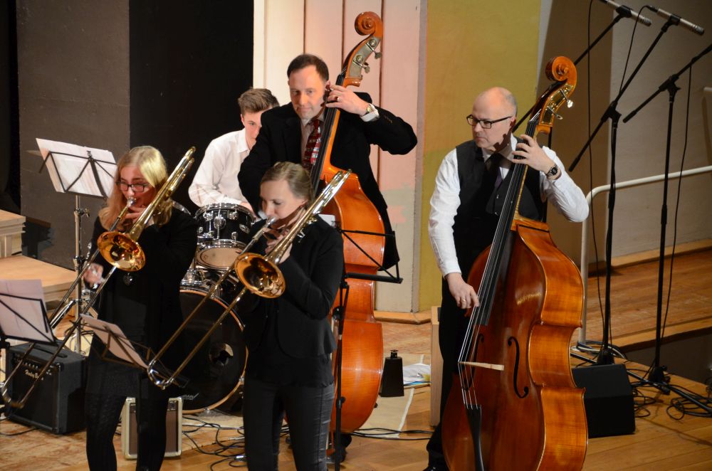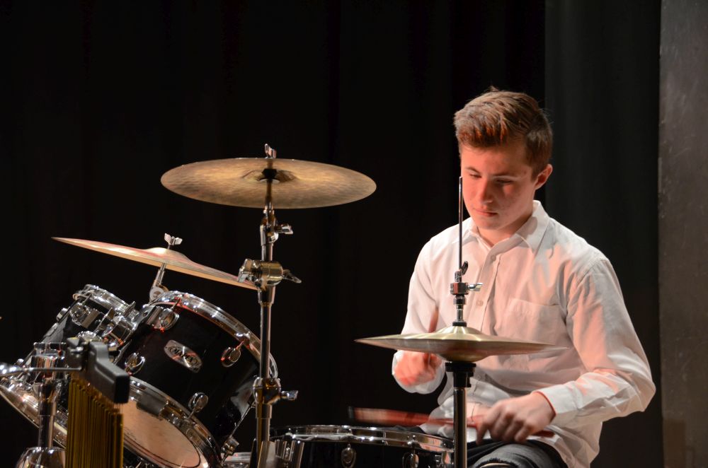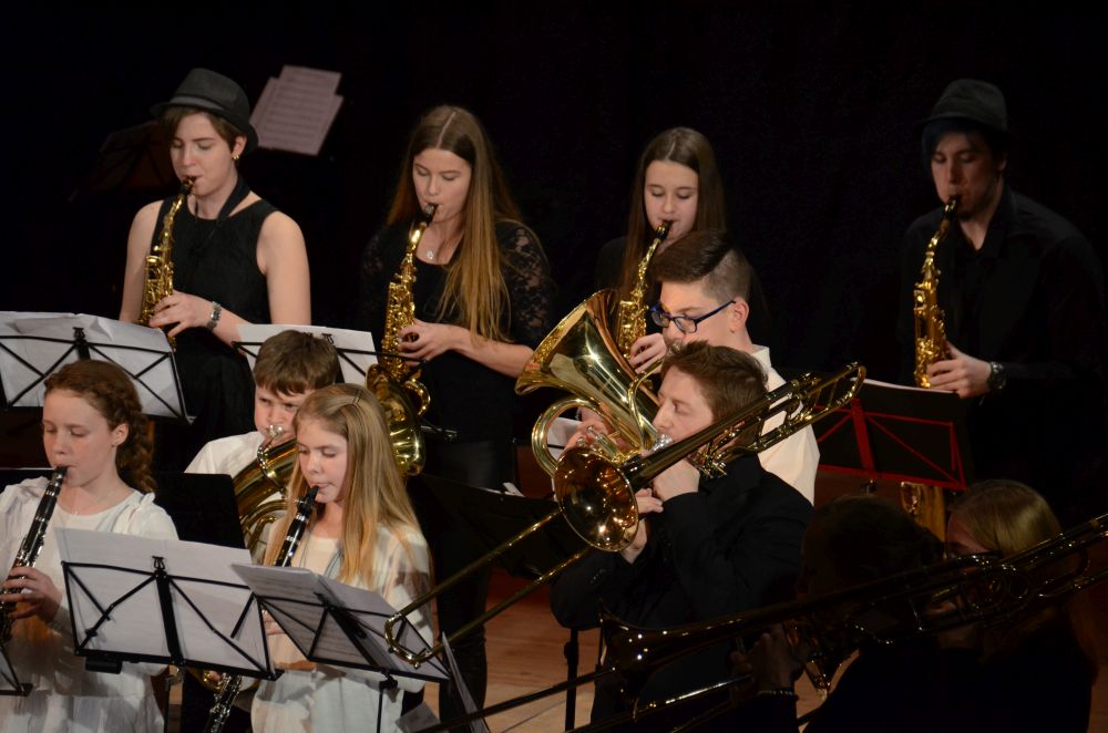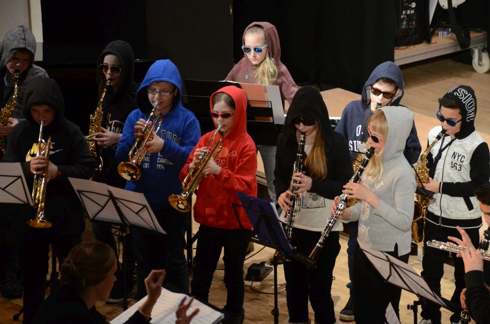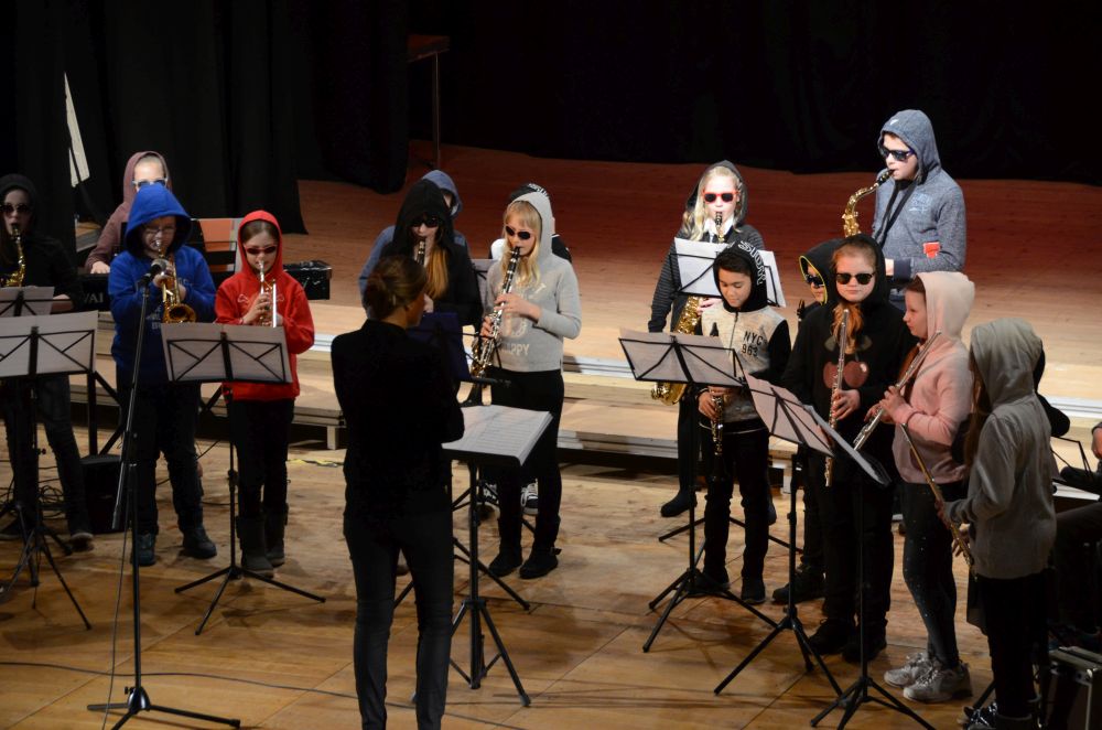 Direkt am Anfang des Abends stand die große, mit Spannung erwartete Premiere der Big-Band-Klasse. Dieses im Schuljahr 2016/2017 erstmals an unserer Schule realisierte Projekt ermöglicht es Schülerinnen und Schülern der 5. und 6. Klassen ein Instrument zu erlernen und das Zusammenspiel im Klassenverband zu trainieren. Nicht nur die sichtbare Spielfreude der rhythmisch wie dynamisch starken Truppe, sondern auch die nach den Neuanmeldungen garantierte Fortsetzung im nächsten Schuljahr bestätigen den Erfolg dieses Projekts.