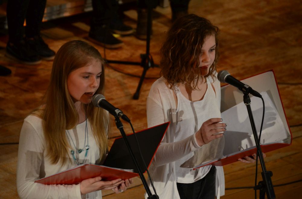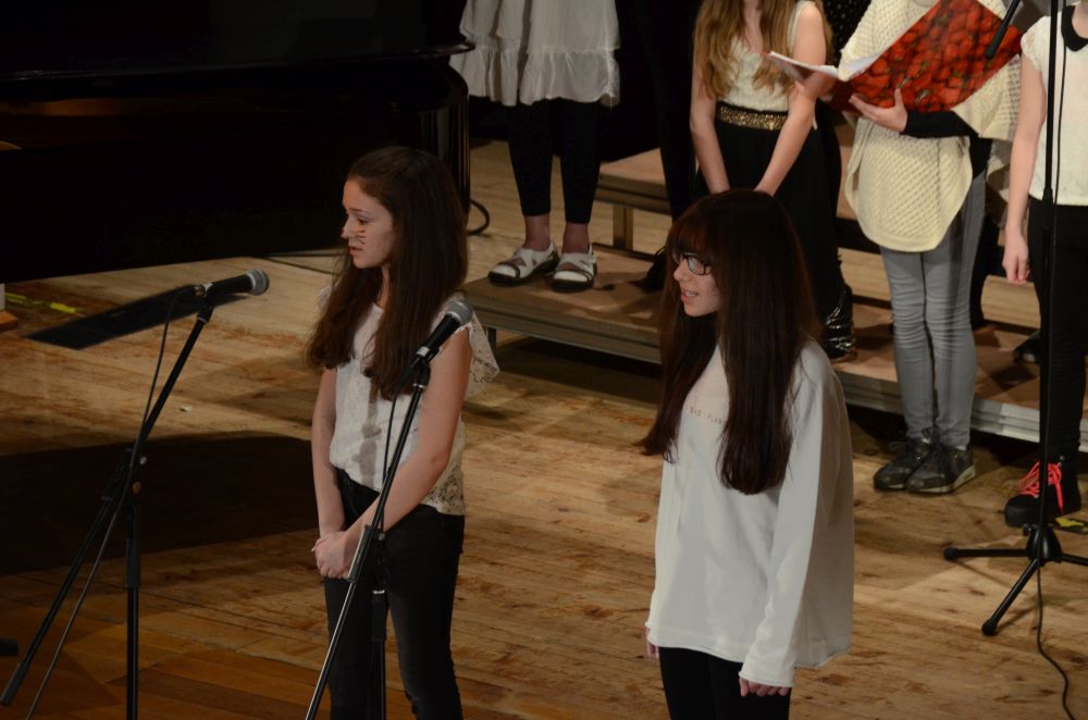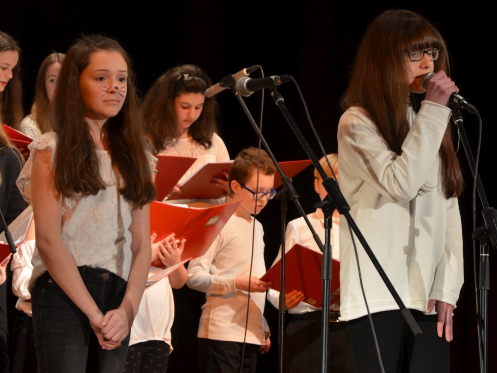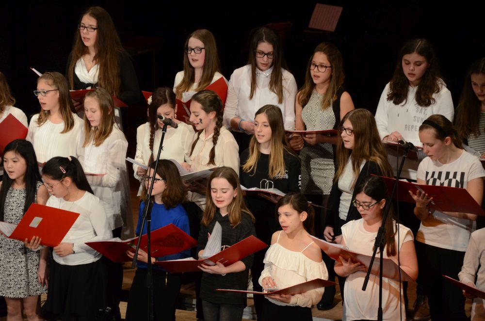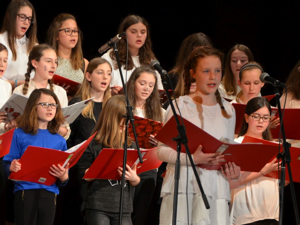 Der anschließend auftretende Chor der Klassen 5-7, schwungvoll am Flügel von Herrn Schlatter begleitet, überzeugte sowohl mit souveränen Solos als auch mit harmonischen Tutti-Passagen.