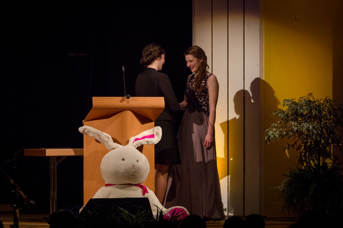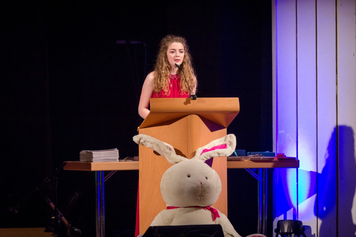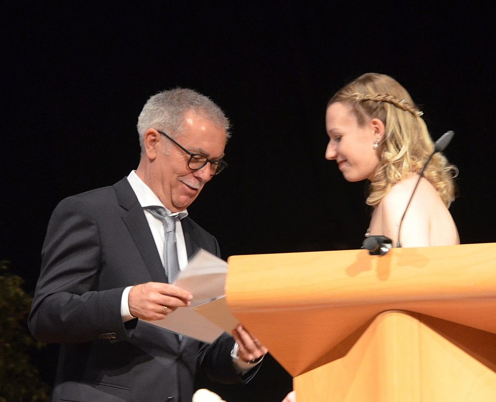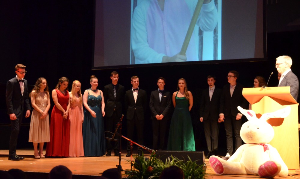 Die Stufe präsentierte sich den ganzen Abend souverän: Angefangen von der lockeren Moderation durch Mareike Luppa und Eric Bahne, über die solistischen Beiträge von Joel Sutter am Klavier und Daniela Wüstenmann an der Klarinette bis hin zum Poetry Slam von Rebecca Mohr. Lara Henkel, Marc Bachmann und Xaver Rößler ließen in ihrer kurzweiligen Abiturrede erkennen, dass der Jahrgang ein sehr positives Bild ihrer Schulzeit in Erinnerung behält und schon ein wenig wehmütig Abschied nimmt.