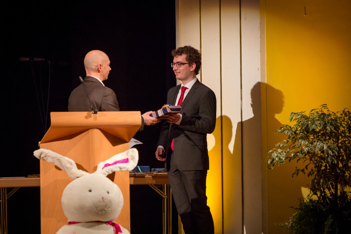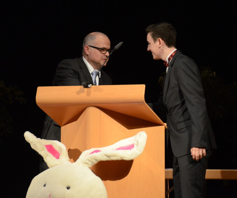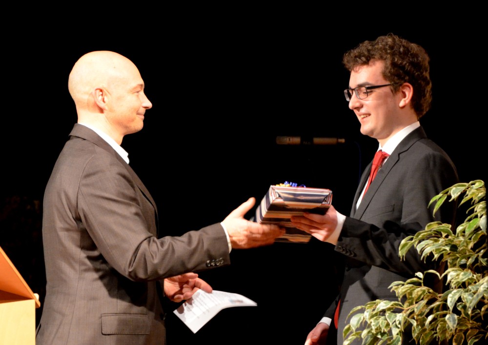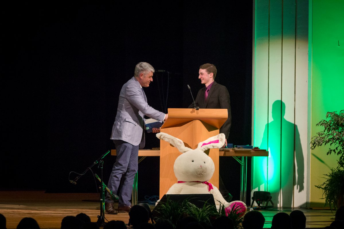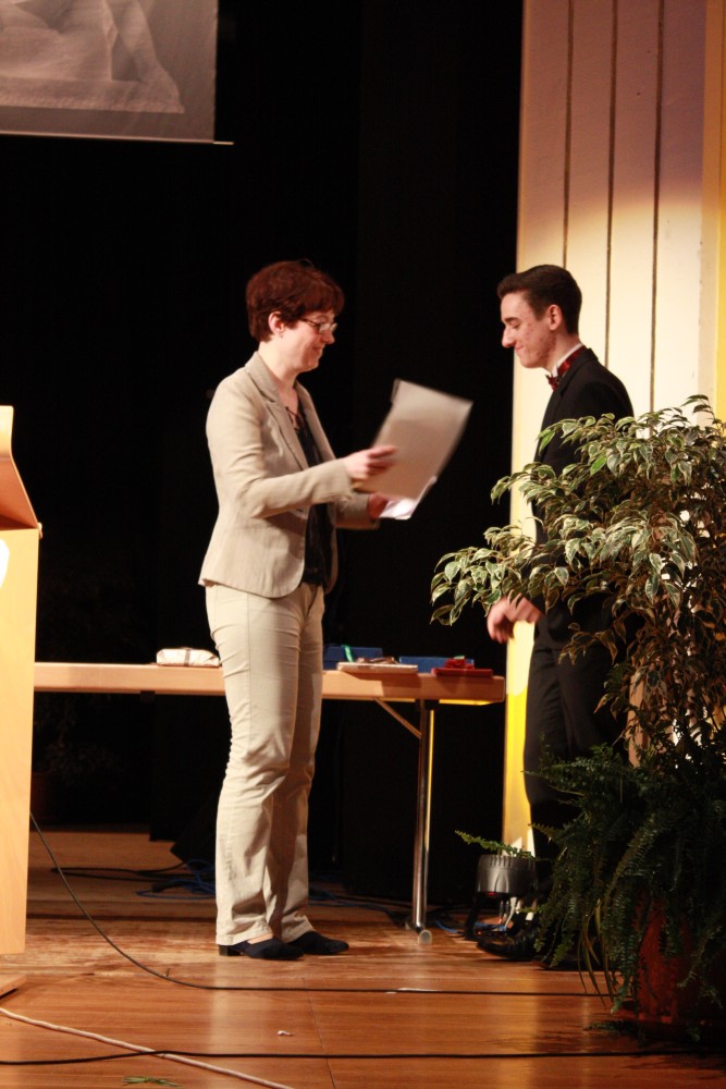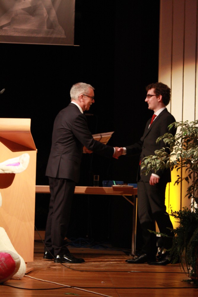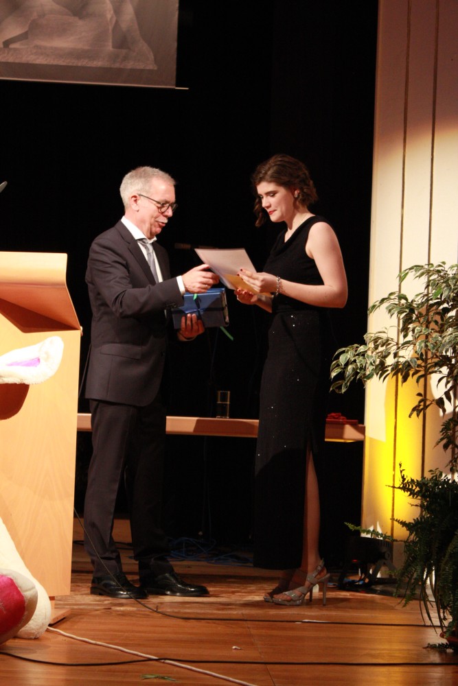 Viele Preise konnten vergeben werden und vergleichsweise viele unterschiedliche Preisträger konnten sich über diese freuen. Wir sind sehr dankbar, dass sich wie jedes Jahr etliche Sponsoren fanden, die Preise gestiftet haben und die diese teilweise auch selbst überbrachten. Und auch dabei gab es eine Premiere mit dem ersten Preis der Fa. convar für einen Absolventen im Leistungskurs Informatik, der mit Nicolas Faroß einen würdigen Abnehmer fand.