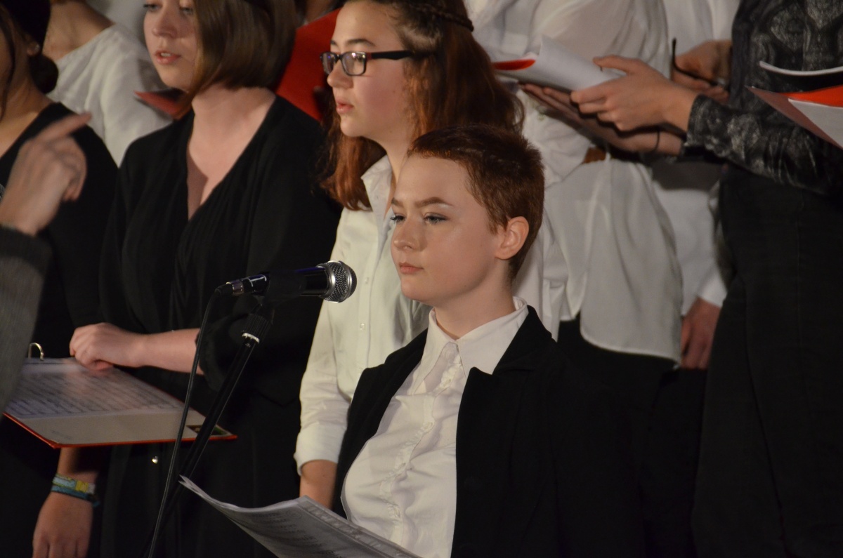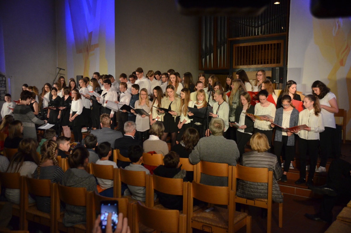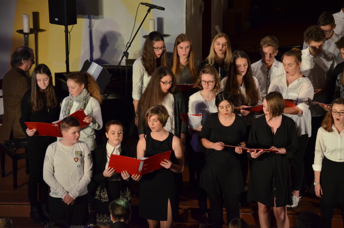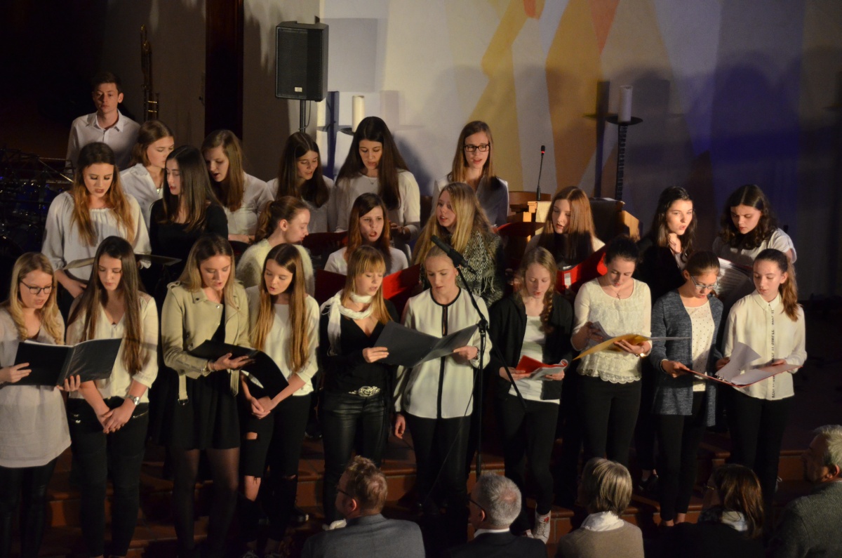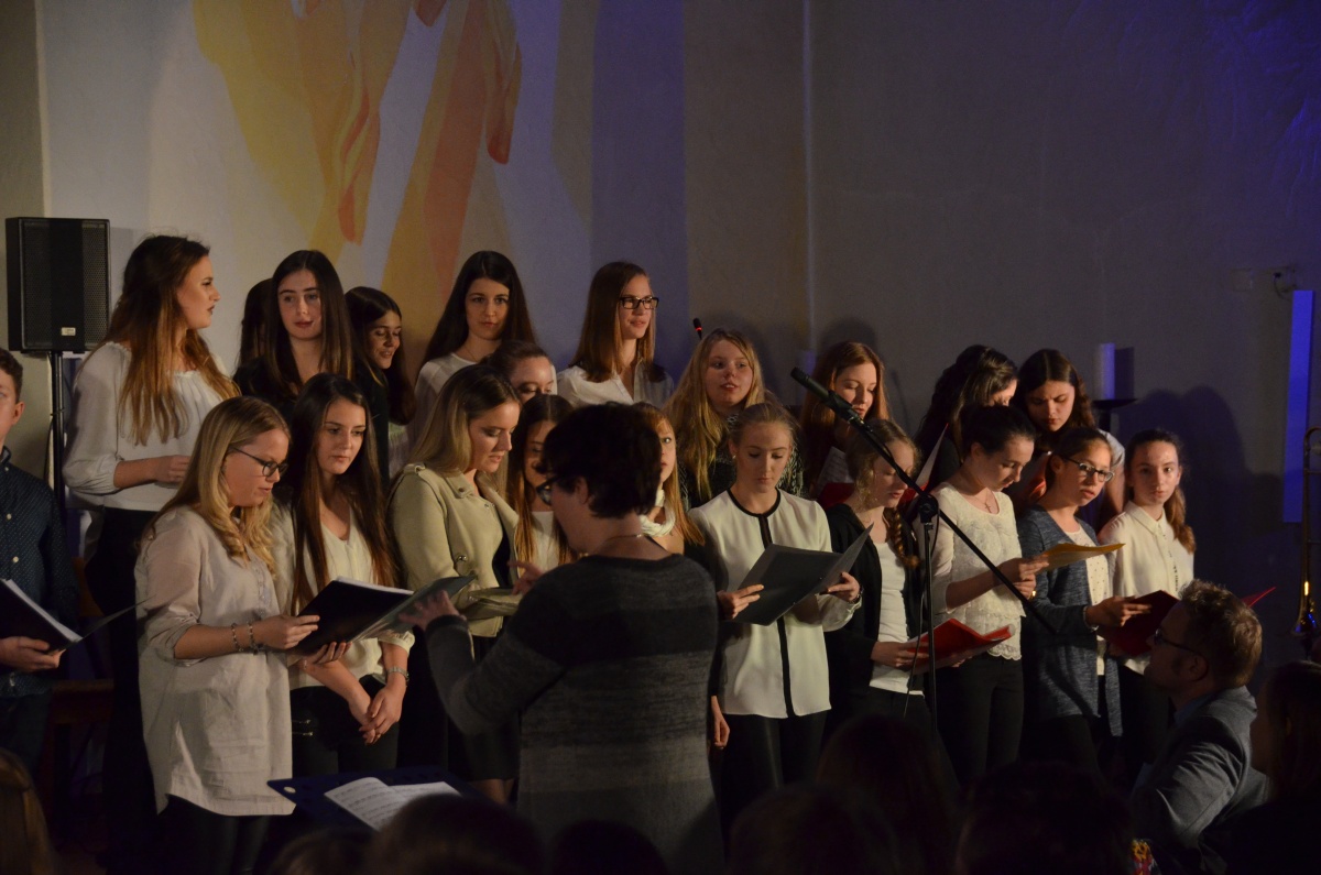 Nach einer kurzen Pause übernahm der Chor der Klassen 8 bis 13 die Bühne und begeisterte, begleitet von Herrn Schlatter am Flügel, mit einer Auswahl an Liedern von Adele. Anspruchsvoll gesetzt und im Wechsel mit überzeugenden Solistinnen, genoss das Publikum einen Querschnitt durch das Album „21“, das schon jetzt zu einem Klassiker der Popgeschichte avanciert ist.