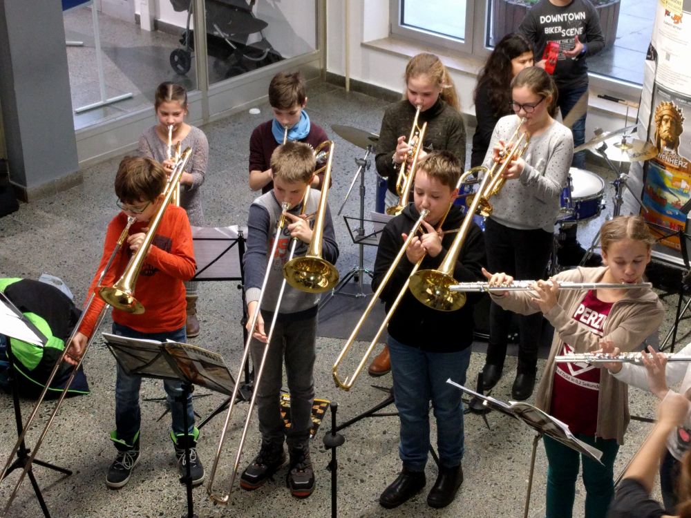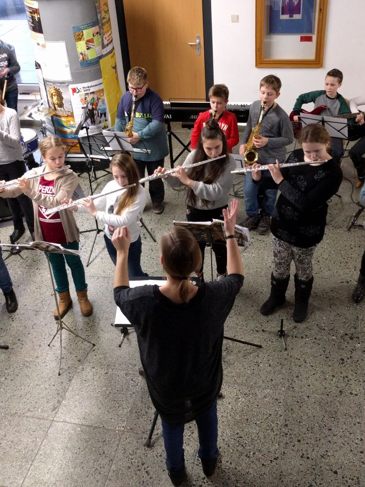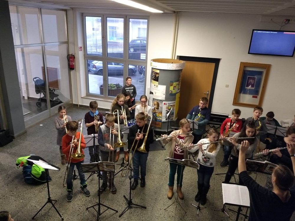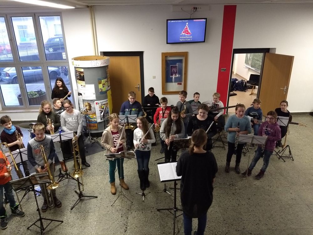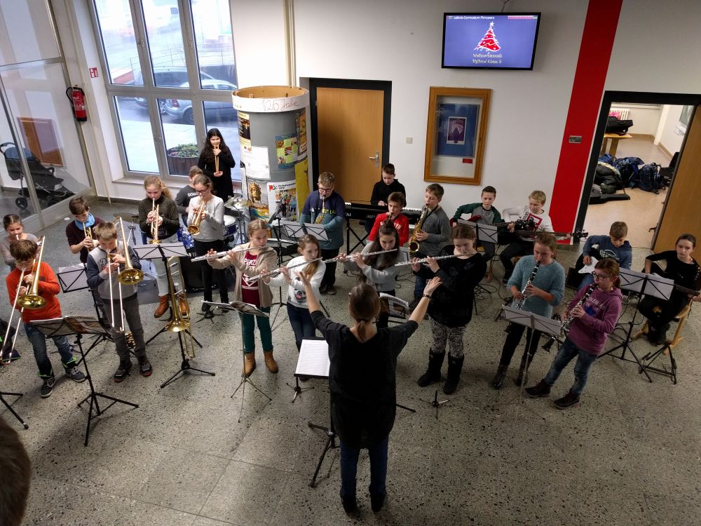 Inzwischen kann man es als schöne Tradition bezeichnen: Am letzten Schultag vor den Weihnachtsferien wird der Schulgemeinschaft in der großen Pause eine musikalische Einstimmung auf das kommende Fest geboten. Nachdem bereits im Vorjahr die Bigband-Klasse diese Aufgabe übernommen hatte, war es auch dieses Jahr der erste Auftritt unserer jüngsten Nachwuchsmusiker aus der Bigband-Klasse.