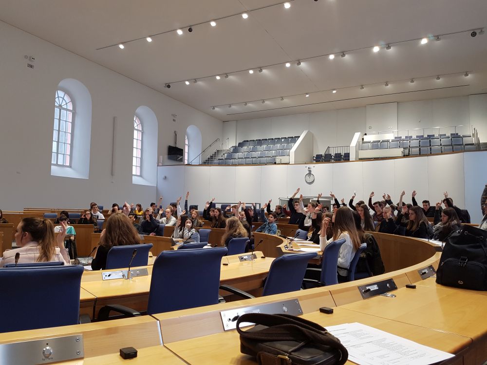 In der zweiten Fraktionssitzung wurden sachpolitische Dinge geregelt, sodass wir zum Schluss einen Antrag erarbeiten konnten. Nach den Fraktionssitzungen begann die Plenarsitzung mit dem ersten Teil der Debatte. In etwa 30 Minuten stellten die Fraktionen ihre Anträge vor und man konnte von seinem Platz aus mitdiskutieren. Nach einer 15-minütigen Pause, in der die Fraktionen sich absprechen konnten und einen Kompromiss fanden, fand der zweite Teil der Debatte statt und zum Schluss wurde endgültig über die Anträge abgestimmt, womit unser Besuch im Landtag endete.