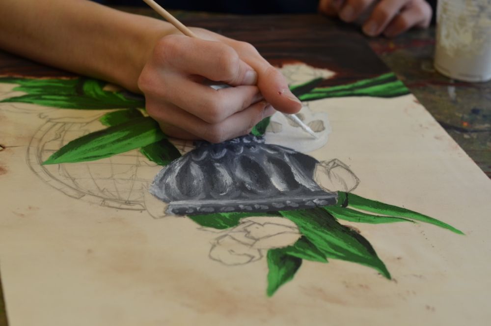 Der GK BK 1 wagt sich derzeit gleichzeitig an symbolgeladene Motive, angelehnt an die Vanitasstillleben des Barock, und an eine sehr alte Maltechnik aus dem Mittelalter, die Eitempera. Die SuS sind einerseits damit befasst, sich mit allgemeiner Symbolik und eigenen Bildideen, Intentionen auseinanderzusetzen, andererseits üben sie sich im Bindemittel für Farbpigmente Herstellen und im komplexen Mischen von Farbwerten. Die Fotos dokumentieren den Prozess.
