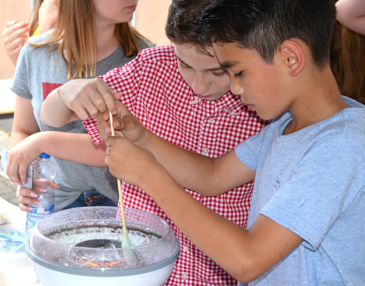 Das Wetter hatte es wieder gut gemeint mit dem jährlichen Schulfest am Leibniz. Zwei Wochen vor den Ferien wartete der fällige Gewitterregen passgenau bis eine halbe Stunde nach dem offiziellen Ende. Die Schulgemeinschaft erlebte ein abwechslungsreiches Fest, das von der Schülervertretung (unterstützt vom Hausmeister), den Klassen und Kursen, den Eltern sowie dem Kollegium gründlich vorbereitet war. Das aus den letzten Jahren bewährte Konzept wurde noch einmal angepasst und die Stände u. a. in die Mitte des Hofes gerückt, was die Atmosphäre noch einmal verbesserte. Wir konnten uns über viele Besucher freuen, die bestens unterhalten und verpflegt wurden. Eine Premiere in diesem Jahr: Das Schulfest war auch die Gelegenheit für die Bienen-AG, den ersten Leibniz-Honig zu schleudern und ganz frisch unter die Besucher zu bringen.