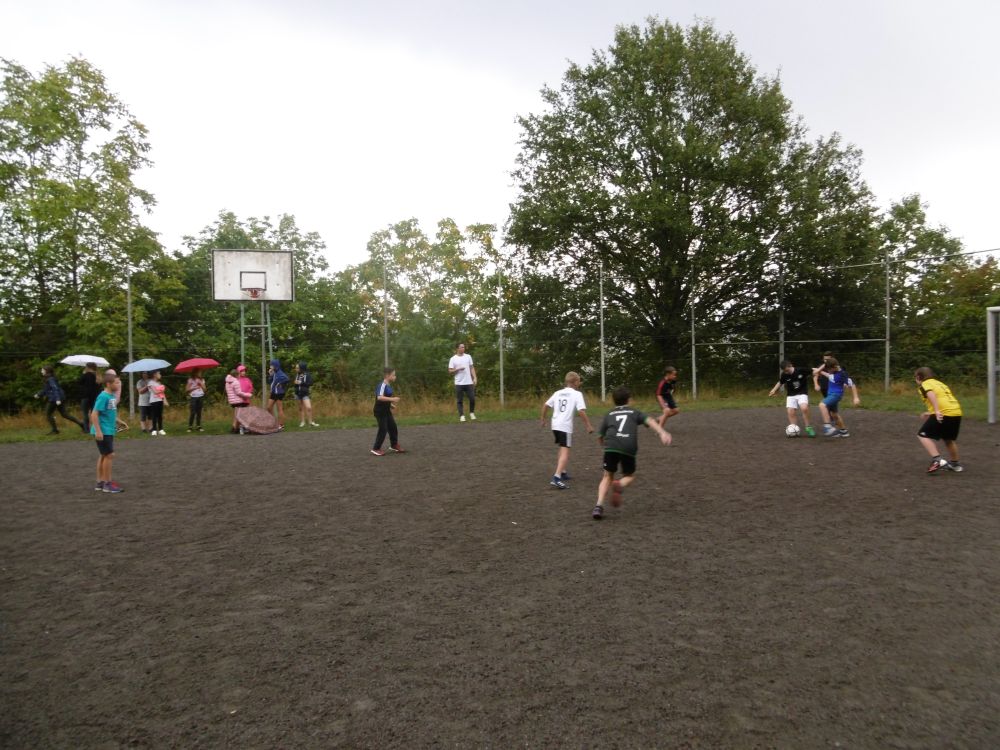 Leider hatte der Wettergott für den Nachmittag Regen angesetzt, aber ein echter Fußballer lässt sich davon nicht beirren. Das Fußballturnier unter Leitung von Herrn Mathes fand trotzdem statt.
