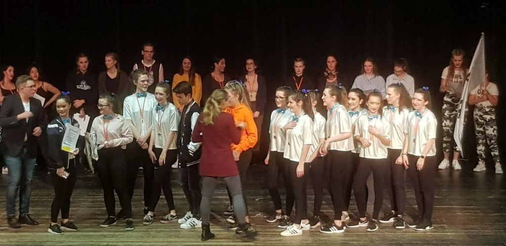 Gegen 16 Uhr wurden wir dann abgeholt für unseren Auftritt. Nach einer kurzen Wartezeit vor dem Saal wurden wir aufgerufen und konnten endlich unseren intensiv trainierten Auftritt vorführen. Nachdem alle Gruppen aufgetreten waren, hatte die Jury eine 30-minütige Beratungszeit.