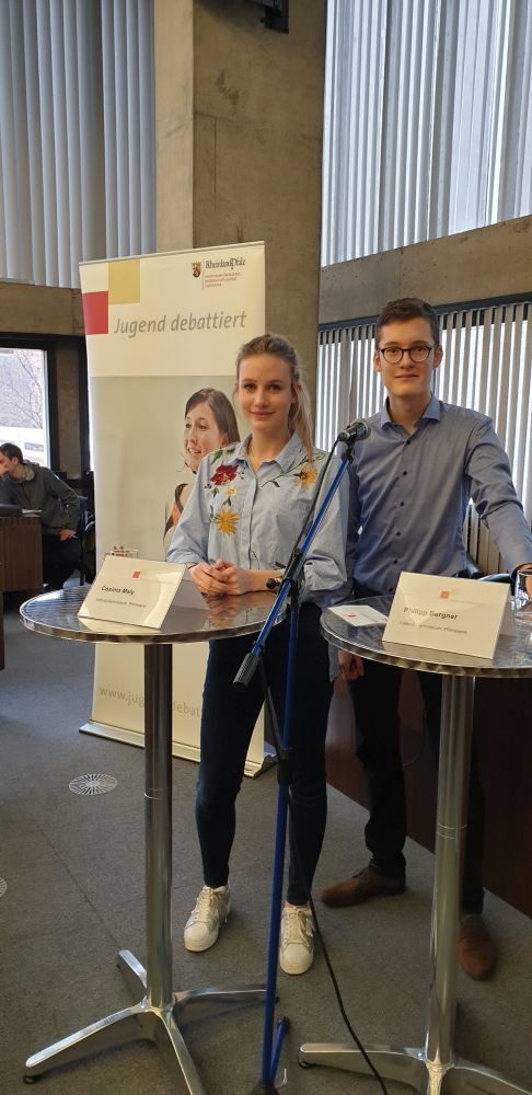 Der erste Schritt für die Teilnahme am bundesweiten Wettbewerb ist der Schulwettbewerb „Jugend debattiert", der am 23.01.2019 an unserer Schule ausgetragen wurde. Dabei konnten sich Cornelius Bergweiler (10b) und Moritz Stein (10a) in der Sekundarstufe I sowie Cosima Maly (MSS 11) und Philipp Bergner (MSS 13) in der Sekundarstufe II für den Regionalwettbewerb in Kaiserslautern qualifizieren.