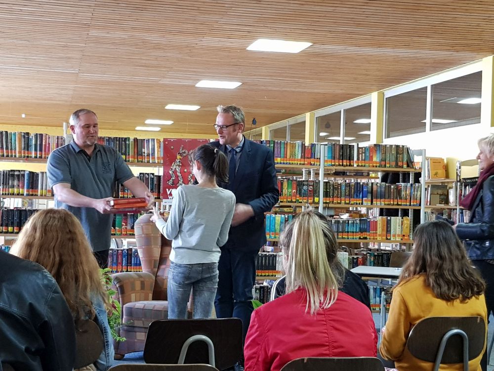 Die fünf Siegerinnen der 6. Klassen der weiterführenden Schulen (Hugo-Ball-Gymnasium, Immanuel-Kant-Gymnasium, Leibniz-Gymnasium, Landgraf-Ludwig-Realschule Plus, Realschule Plus Kirchberg) trafen sich in der Zweigstelle der Stadtbücherei an der Realschule Plus Kirchberg. Jede Teilnehmerin las jeweils drei Minuten aus einem selbstgewählten Buch, dann eine nicht vorbereitete Textstelle.
